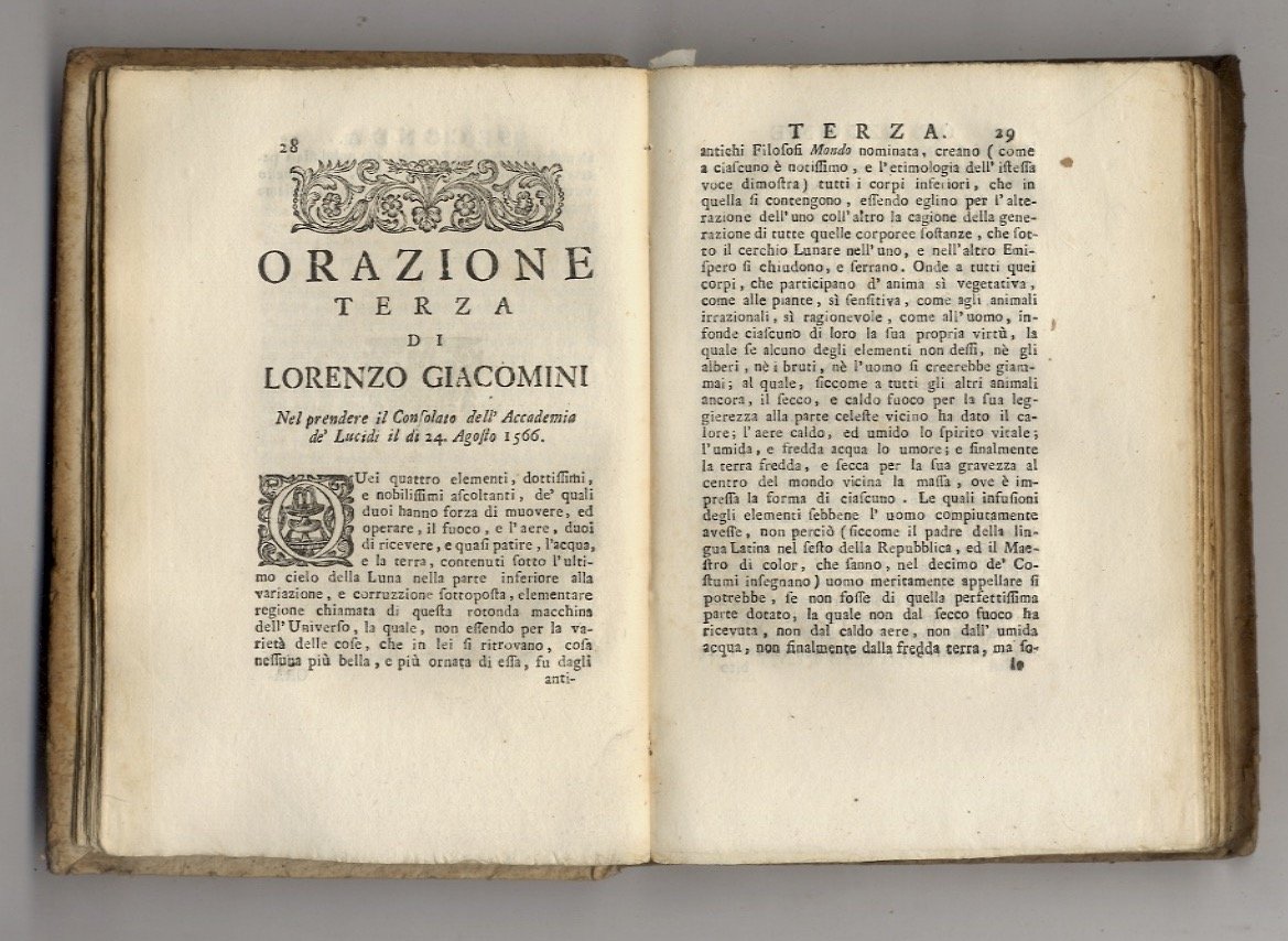In Firenze, Nella Stamperia di Sua altezza Reale, per li Tartini, e Franchi, 1731, in-8, cartone rustico coevo con titolo manoscritto al dorso, pp. XXVI, 298. Con testate, finali ed iniziali in xilografia. Testi di Michelagnolo Bonarruoti, Pietro Accolti, Vieri Cerchi (in lode di Cosimo II Granduca di Toscana); di Vieri Cerchi (in lode di Don Francesco Medici de' Principi di Toscana); di Lionardo Salviati (in lode di Don Garzia de' Medici); di Alessandro Minerbinetti (in lode di Belisario Vinta Senatore, Primo Consigliere, e Segretario di Stato del Granduca di Toscana); di Torquato Malaspina (detta al Capitolo Generale de' Cavalieri di Santo Stefano l'anno 1578), ecc. Un solo volume (su 6), ma in se completo, contenenti 12 orazioni. Note (ottocentesche?) in matita alla carta di guardia anteriore: lista di generi alimentari e relativo costo. Ottime condizioni, salvo pochi forellini di tarlo al margine interno delle pagine 49-62.