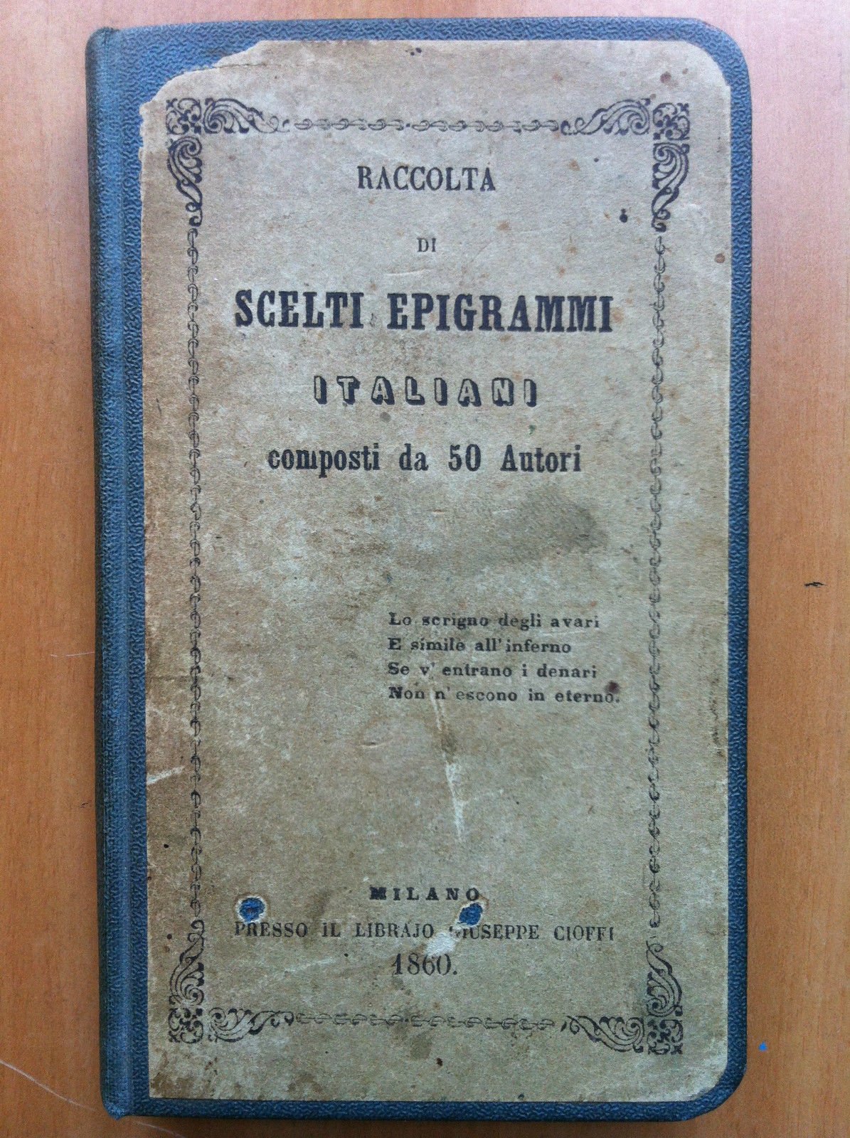 RACCOLTA DI SCELTI EPIGRAMMI ITALIANICOMPOSTI DA 50 AUTORILibraio Giuseppe Cioffi Milano 1860191 pagine - formato 8x13,5 cmOttimo stato (80 g)E16002