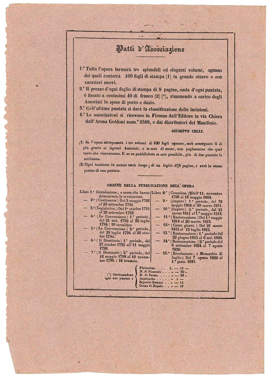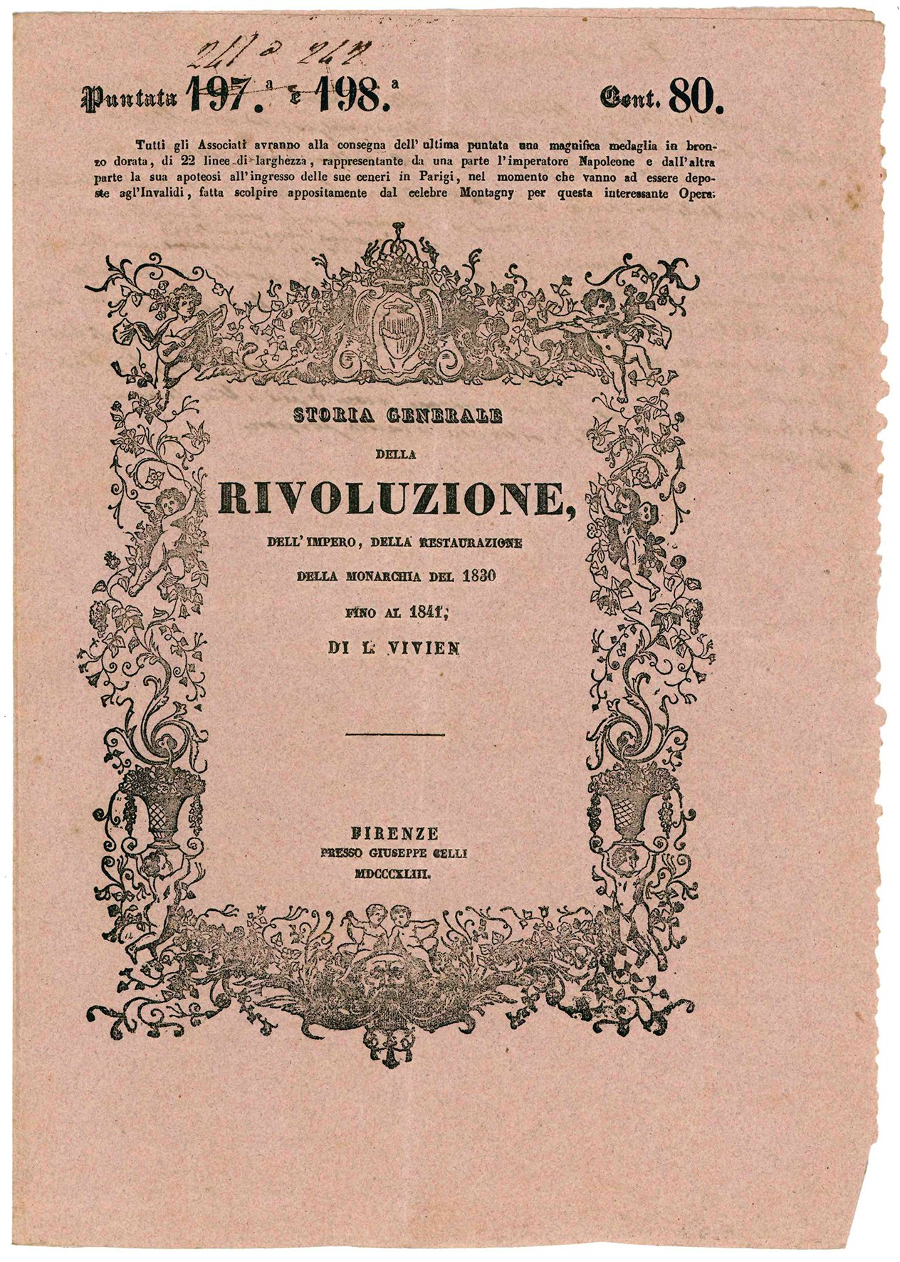 -VIVIEN, L. Storia generale della Rivoluzione, dell'Impero, della Restaurazione della Monarchia del 1830 fino al 1841. Firenze, Giuseppe Celli, 1843. Bifolio di mm. 275x193 stampato su carta rosa. Il prospetto contiene uno specimen del frontespizio dell'opera, il numero e il costo delle dispense, nonché le condizioni di sottoscrizione dell'opera composta da tre volumi. Al verso della prima carta un abbozzo manoscritto di lettera non pertinente con il prospetto. Ottima conservazione;