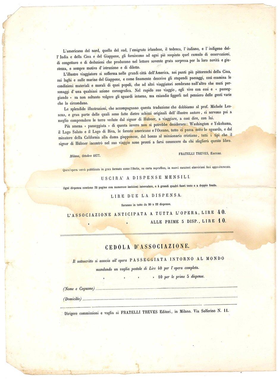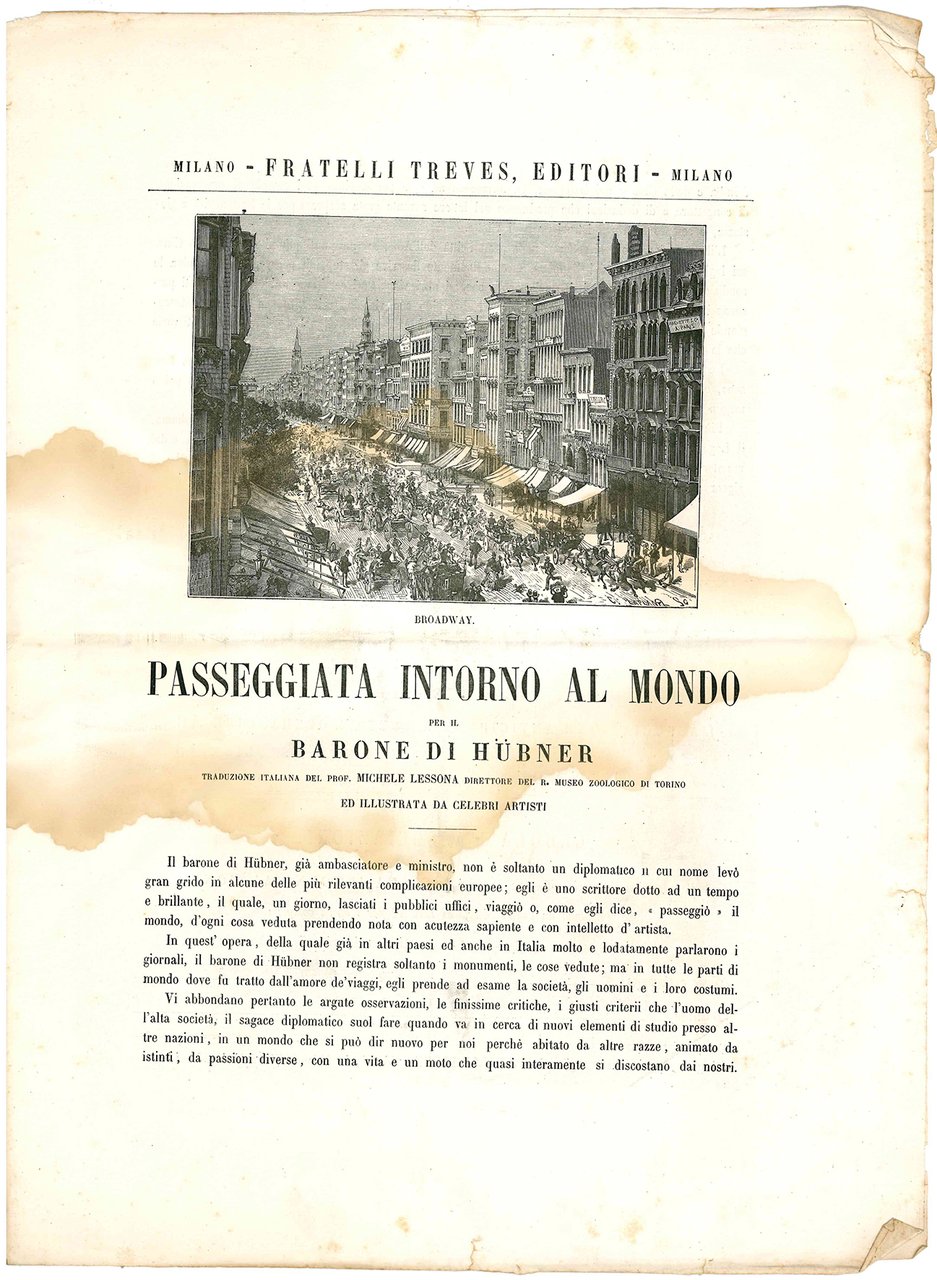 -HÜBNER, Barone di. Passeggiata intorno al mondo… Traduzione italiana di Michele Lessona. Milano, Fratelli Treves, 1877. Bifolio di mm. 395x290. Traccia di piegatura centrale, forte alone al centro, angoli un po' logori. Bel prosetto editoriale di grandi dimensioni contenente specimina del testo e della parte iconografica dell'opera publicizzata, nonché copia della cedola d'associazione.