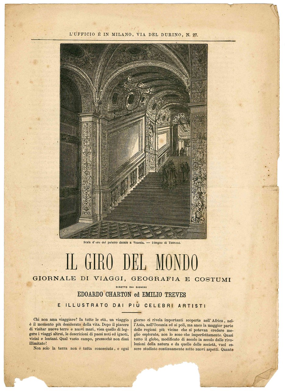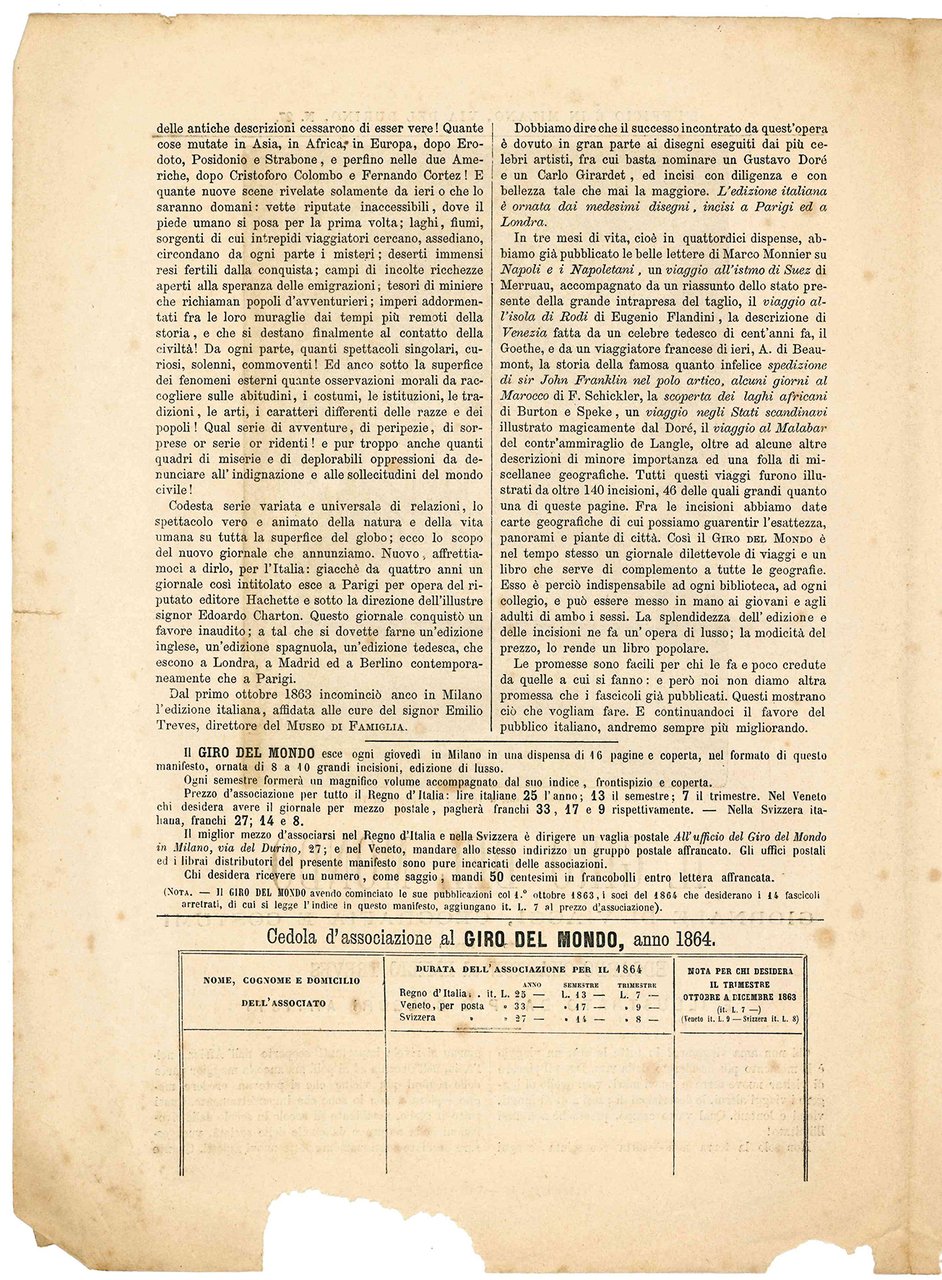 -CHARTON, E. & TREVES, E. Il giro del mondo. Giornale di viaggi, geografia e costumi. Milano, Tip. P. Agnelli, 1863. Bifolio di mm. 315x225. Fioriture, bruniture e mancanze marginali, che tuttavia non comportano perdita di testo. Il prospetto contiene una descrizione dell'opera, uno specimen del testo e delle illustrazioni, una cedola d'associazione, l'elenco delle dispense in uscita nel 1863 e l'elenco dei viaggi che saranno pubblicati nel 1864;