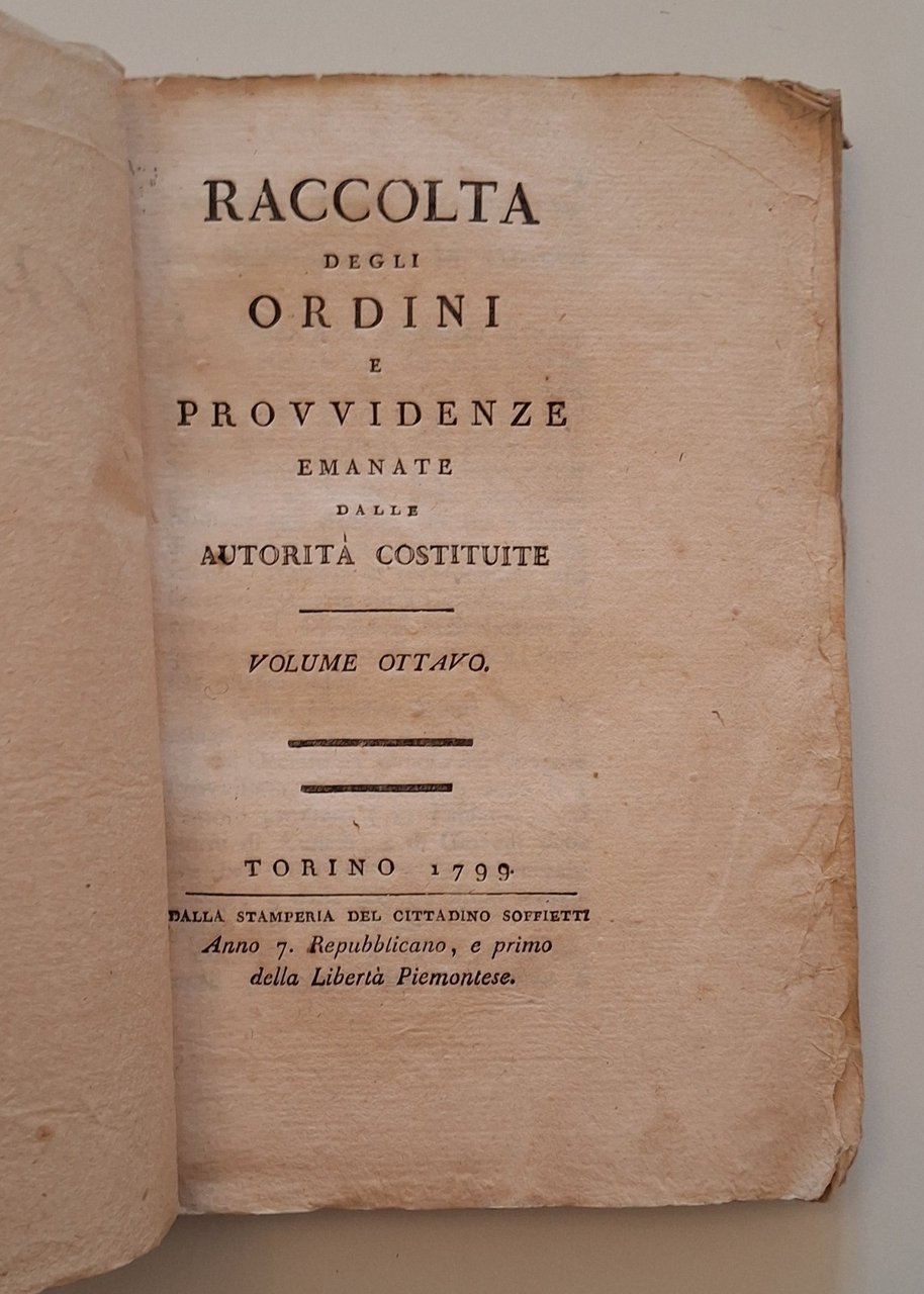 RACCOLTA DEGLO ORDINI E PROVVIDENZE EMANATE DALLE AUTORITA' COSTITUITE VOL. 1-7-8-10-12-13 TORINO STAMPERIA DEL CITTADINO SOFFIETTI 1799In 8°, 6 volumi, legatura cartacea coeva, tavola ripiegata.Segni e mancanze alle copertine.TUTTI I NOSTRI LIBRI SONO VISIBILI PREVIO CONTATTO MAIL, TELEFONO O WHATSAPP NELLA NUOVA SEDE DI MILANO: LIBRERIA COSMOPOLIS, PIAZZALE MACIACHINI 13, MILANO.3313109672