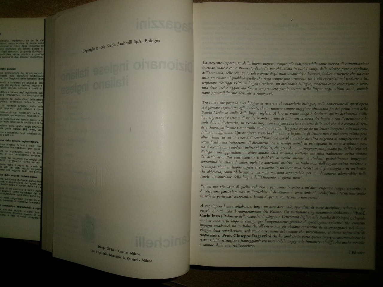RAGAZZINI. Dizionario inglese italiano - italiano inglese. Bologna, Zanichelli, 1967. Oltre 100.000 voci. americanismi, neologismi e tecnicismi dell' uso corrente. 2.900 sigle, simboli e abbreviazioni. 3.200 nomi propri invariati. In-8°, similpelle con sovracopertina. XIII, 1864 pp. In ottimo stato di conservazione. Uff. stanz. TV mob. fronte nostro