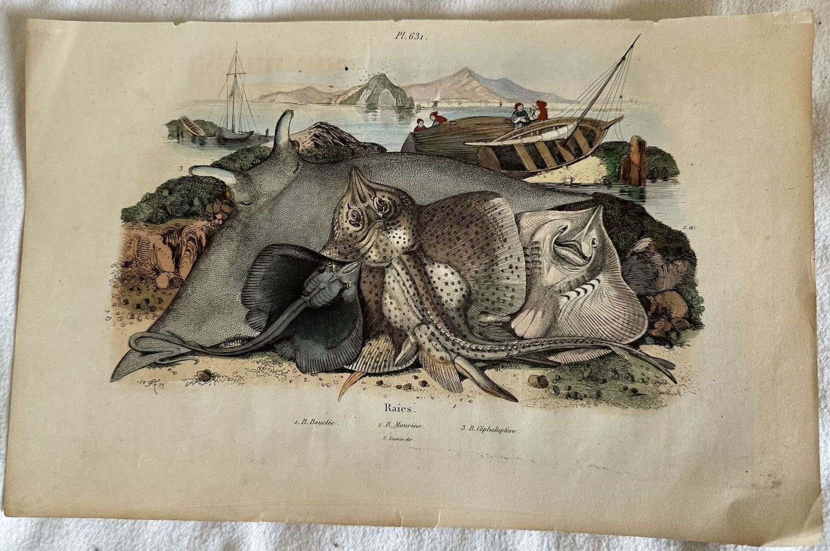 Incisione del 1839 colorata a mano che mostra diverse specie di razza. Data: 1839 Autore: E. Guerin Tecnica: xilografia acquarellata a mano Dimensione del foglio: 185x290 mm Dimensione incisione: 135x220 mm Condizioni: Buone. Alcune fioriture. Nice woodcut of 1839 coloured by hand representing different species of rays Date: 1839 Author E. Guerin Technique: xilography painted by hand Size of the page: 185x290 mm Size of the engraving: 135x220 mm Conditions: Good conditions. Some foxing