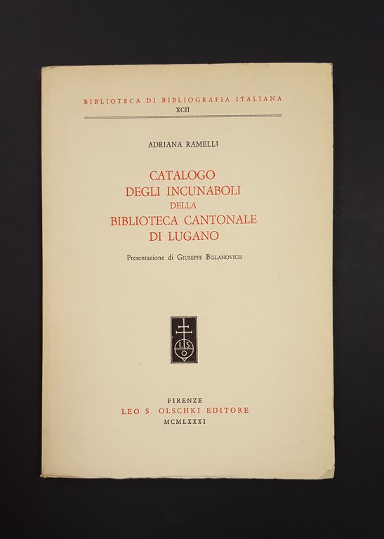 Ramelli Adriana. Catalogo degli incunaboli della Biblioteca Cantonale di Lugano. Leo S. Olschhki Editore. 1981