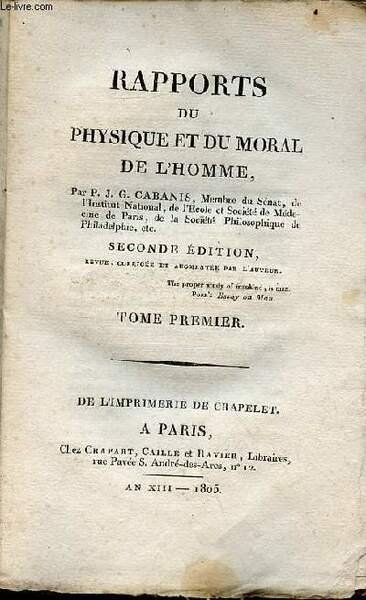 Rapports de physique et du moral de l'homme - Tome premier - Seconde édition revue, corrigée et augmentée par l'auteur.