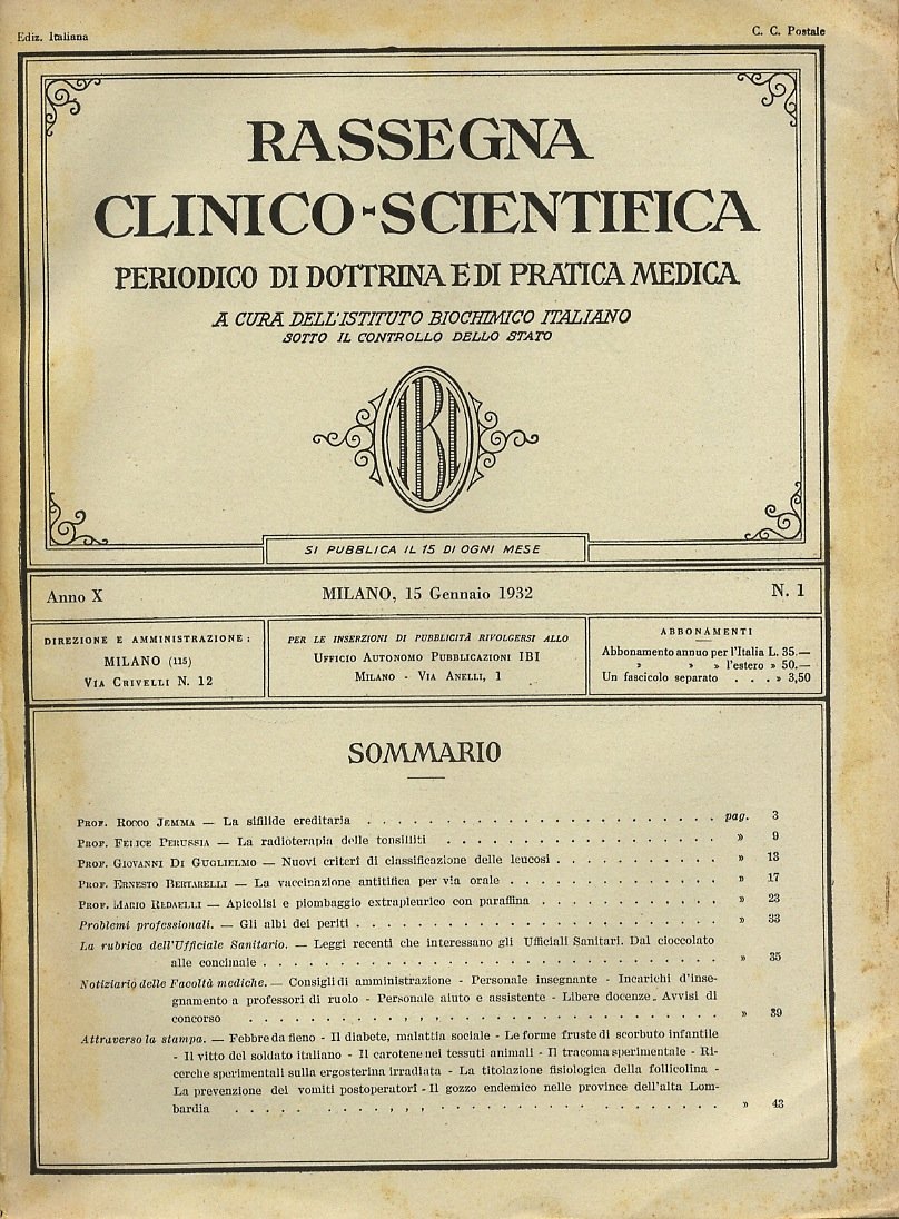 Rassegna Clinico-Scientifica dell'Istituto Biochimico Italiano sotto il controllo dello Stato. Pubblicazione mensile. (poi:) Periodico di dottrina e pratica medica. Direttore: G. Lorenzini. Edizione italiana. Anni V: NN. 1-12; X: NN. 1-12 (uno doppio); XII: NN. 1-3, 5-12.