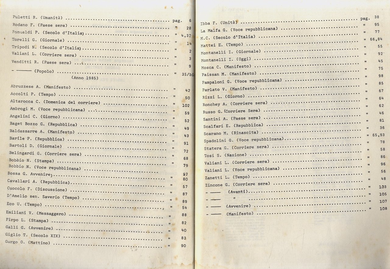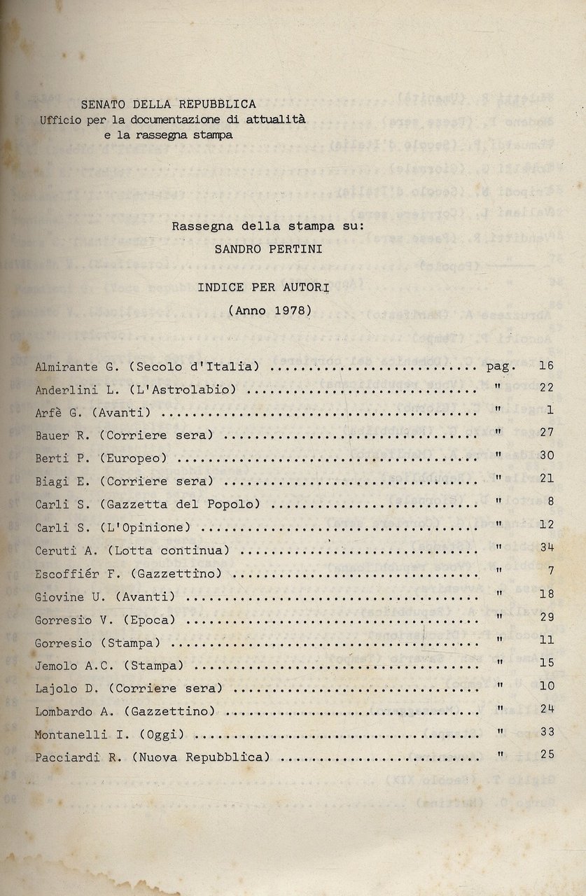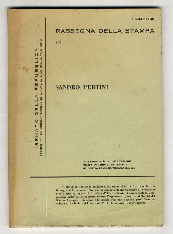 [Roma], Senato della Repubblica, 4 luglio 1985, in-4, br. editoriale, pp. 108. Pubblicazione fuori commercio, curata dal Senato, compilata sulla base dei principali quotidiani e periodici italiani. Assolutamente non comune.