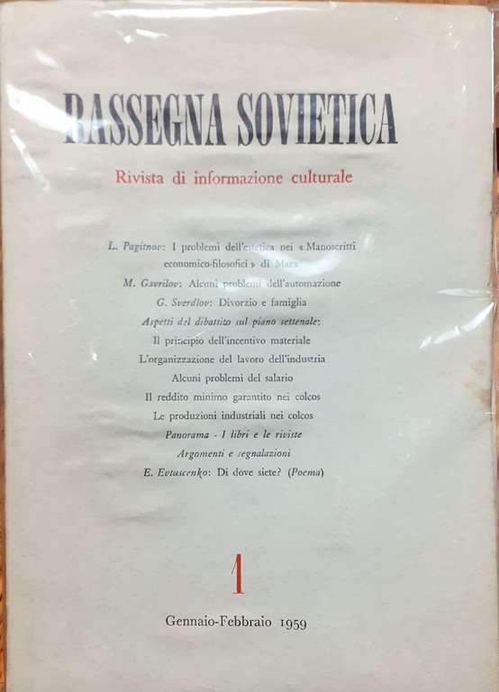 I ed.. Anno X, Nn. 1-16, Gennaio-Dicembre 1959 del bimestrale + Indici 1956-1958. Rivista edita dall'Associazione per i rapporti culturali con l'Unione Sovietica. Redazione e Amministrazione: Roma, Piazza della Repubblica, 47. Sette fascicoli (compreso quello dedicato agli Indici 1956-1958) in-8^ piccolo sciolti rilegati in brossura in cartoncino martellato avorio con titoli in nero e rosso. Stato nel complesso buono (leggera usura delle copertine - copertine e pagine brunite e con qualche fioritura - fascicoli quasi interamente intonsi (escluso il fascicolo degli Indici) - fascicolo 1 ondulato da umidità). N. 1, Gennaio-Febbraio 1959: pp. 120- N. 2, Marzo-Aprile 1959: pp. 120 - N. 3, Maggio-Giugno 1959: pp. 120 - N. 4, Luglio-Agosto 1959: pp. 120 - N. 5, Settembre-Ottobre 1959: pp. 120 - N. 6, Novembre-Dicembre 1958: pp. 128 - Indici 1956-1958 (Giugno 1959): pp. 20.