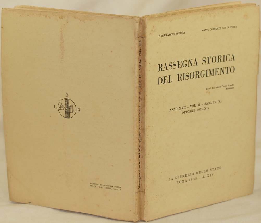 In 8. Dim. 25x18 cm. Pp. (2)+da 527 a 678. Numero del Ottobre 1935 di questa celebre pubblicazione storica fonte di incessante ed eccezionale mole di notizie sul periodo risorgimentale. All'interno: Lo Statuto Pontificio nel quadro costituzionale del 1848, Di alcuni patriotti forlivesi esuli in Corsica, Il colpo di stato di Napoleone III nelle testimonianze di alcuni esuli mazziniani, I "Canti dell'esilio" di Luigi Mercantini ecc. In ottime condizioni. Copertina editoriale in ottime condizioni generali con lievi usure ai margini e dorso. Legatura in buone condizioni. All'interno le pagine si presentano in buone condizioni con fioriture, ancora unite tra loro.Number of October 1935 of this famous historical pamphlet source of different information about Risorgimento period. Inside: Statuto Pontificio in constitutional frame of 1848, About some patriots from Forli exiliated in Corsica, Napoleone III in testimonies of some exiliated followers of Mazzini, "Canti dell'esilio" by Luigi Mercantini ecc. In very good conditions. Editorial cover in very good general conditions slightly worn in the edges and spine. Binding in good conditions. Inside pages are in good conditions with foxings, some still bound together.