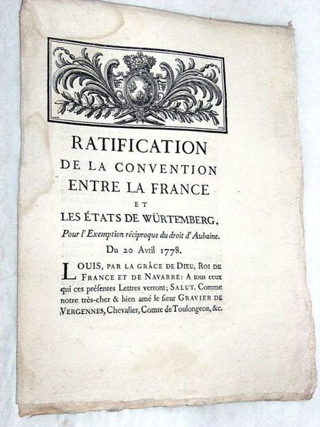 RATIFICATION de la Convention entre la France et les Etats du Duc de Würtemberg, Pour l'Exemption réciproque du droit d'Aubaine. Du 20 Avril 1778.