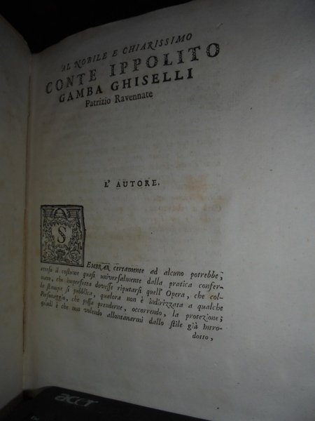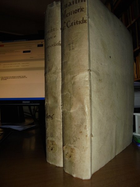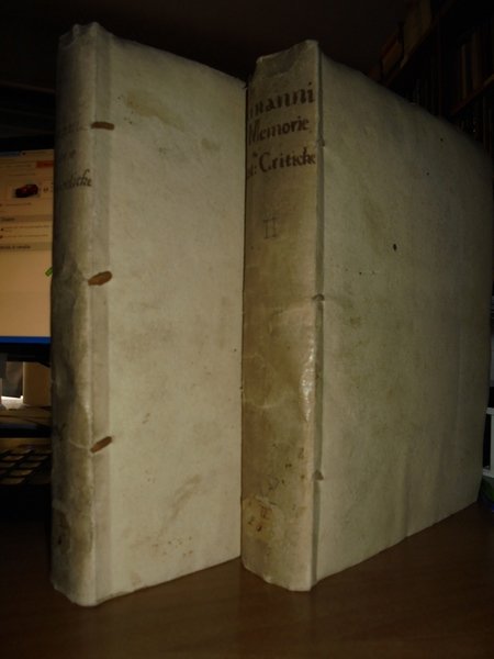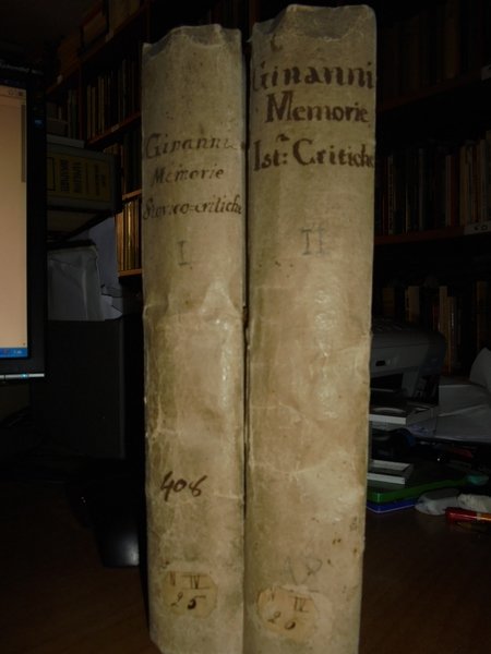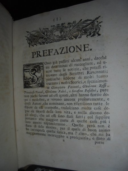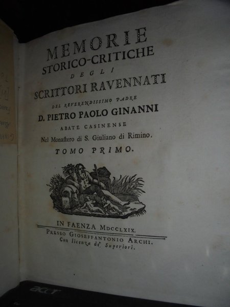 Giananni Pietro Paolo. In Faenza, presso Gioseffantonio Archi, 1769. Memorie storico-critiche degli Scrittori Ravennati. Tomo primo (-secondo). Due volumi in-4° (mm 253x191), cartone officinale dell' epoca con i titoli al dorso. (viii), xxviii, 468 pp.; 547, (1) pp. Vignette xilografiche ai frontespizi. Capilettera ornati, testatine e finalini incisi in legno. Esemplare in ottimo stato di conservazione nel suo stato originale. Prima edizione, e forse unica, di opera di straordinario interesse storico-letterario per la città di Ravenna; in essa si danno notizie bio-bibliografiche non reperibili altrove su tutti gli scrittori, insigni o meno, d' origine ravennate, disposti in ordine alfabetico. Repertorio raro e ricercato. Lozzi, 3901. Platner, 279. Cas