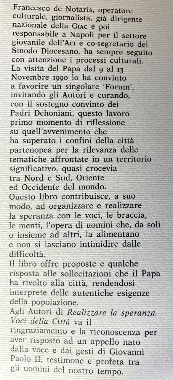 Francesco de Notaris, operatore culturale, giornalista, già dirigente nazionale della GIAC e poi responsabile a Napoli per il settore giovanile dell'Aci e co-segretario del Sinodo Diocesano, ha sempre seguito con attenzione i processi culturali. La visita del Papa dal 9 al 13 Novembre 1990 lo ha convinto a favorire un singolare Forum, invitando gli Autori e curando, con il sostegno convinto dei Padri Dehoniani, questo lavoro primo momento di riflessione su quell'avvenimento che ha superato i confini della città partenopea per la rilevanza delle tematiche affrontate in un territorio significativo, quasi crocevia tra Nord e Sud, Oriente ed Occidente del mondo.