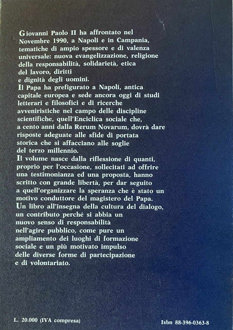 Giovanni Paolo II ha affrontato nel Novembre 1990, a Napoli e in Campania, tematiche di ampio spessore e di valenza universale: nuova evangelizzazione, religione della responsabilità, solidarietà, etica del lavoro, diritti e dignità degli uomini. Il Papa ha prefigurato a Napoli, antica capitale europea e sede ancora oggi di studi letterari e filosofici e di ricerche avveniristiche nel campo delle discipline scientifiche, quell'Enciclica sociale che, a cento anni dalla Rerum Novarum, dovrà dare risposte adeguate alle sfide di portata storica che si affacciano alle soglie del terzo millennio. Il volume nasce dalla riflessione di quanti, proprio per l'occasione, sollecitati ad offrire una testimonianza ed una proposta, hanno scritto con grande libertà, per dar seguito a quell'organizzare la speranza che è stato un motivo conduttore del magistero del Papa. Un libro all'insegna della cultura del dialogo, un contributo perché si abbia un nuovo senso di responsabilità nell'agire pubblico, come pure un ampliamento dei luoghi di formazione sociale e un più motivato impulso delle diverse forme di partecipazione e di volontariato.