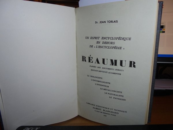 JEAN, TORLAIS. Paris, Albert Blanchard, 1961. Réamur. D' après des documents inédits. Un esprit Encyclopédique en dehors de << L' Encyclopédie >>. Edition revue et augmmentée. In-8° piccolo, tela con titolo in oro entro tassello al dorso, copertine originali conservate. 475, (ii) pp. con alcune tavole fuori testo. In ottimo stato di conservazione o come nuovo in legatura recente. Uff. C - II - 7 - 2