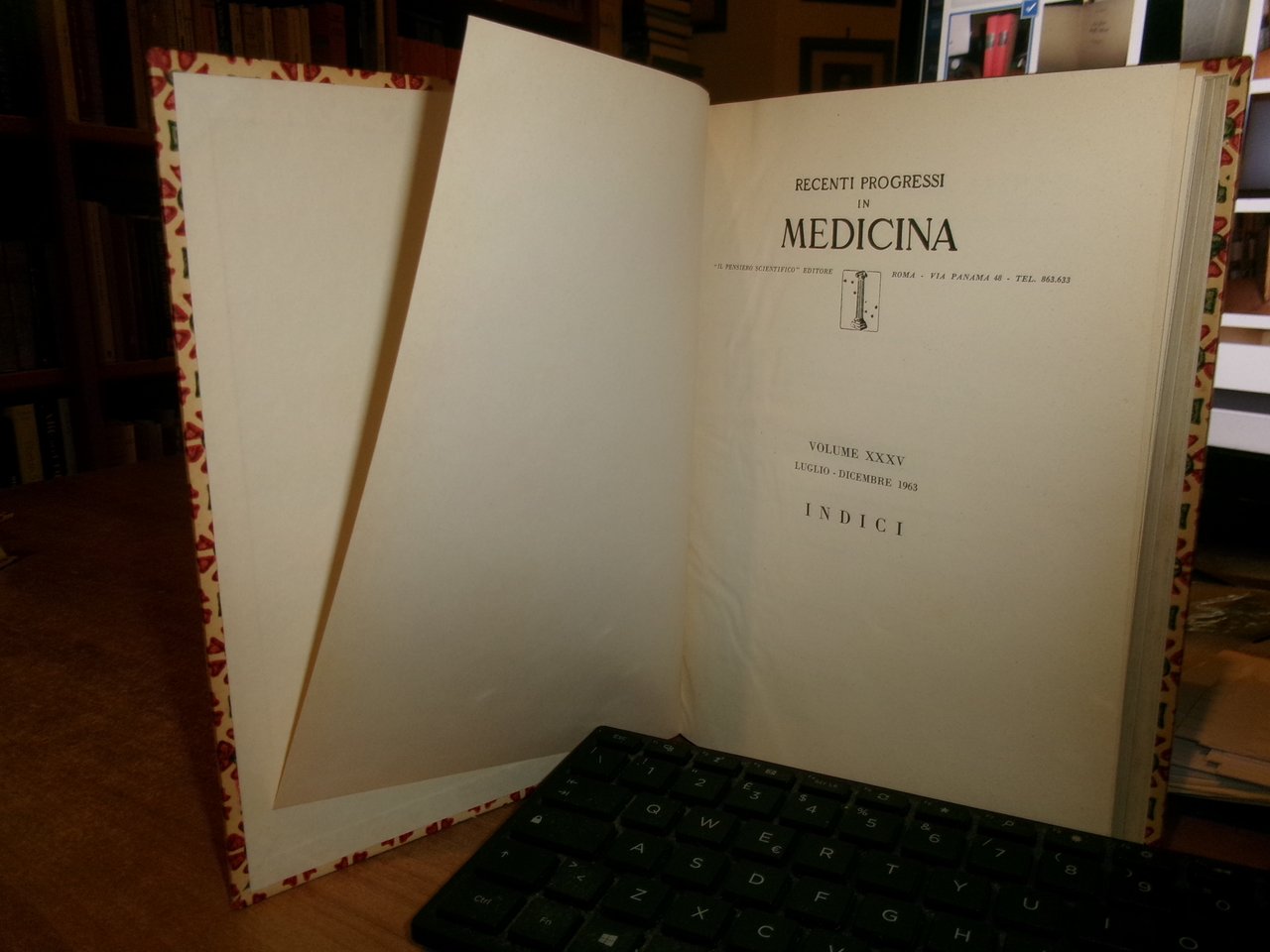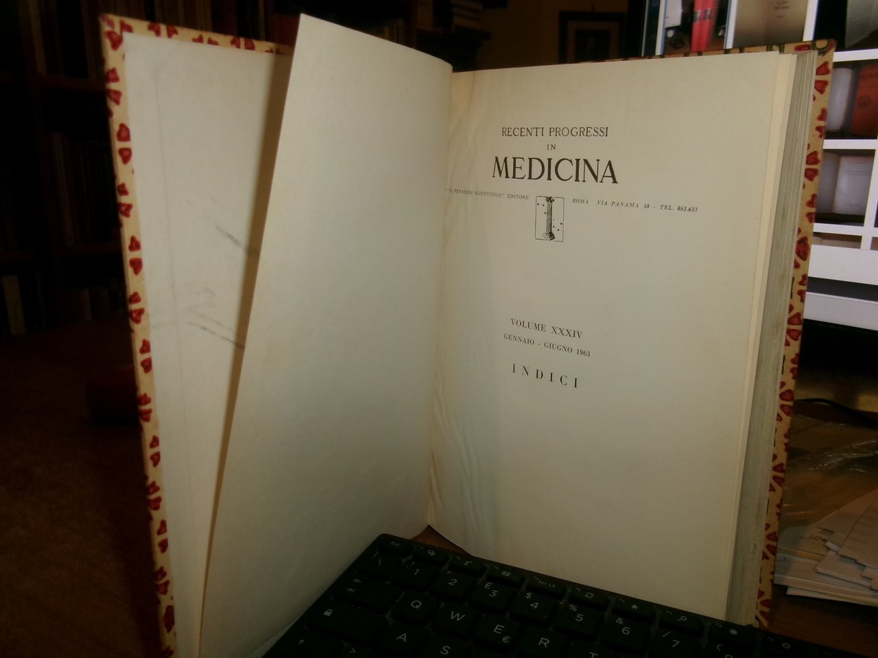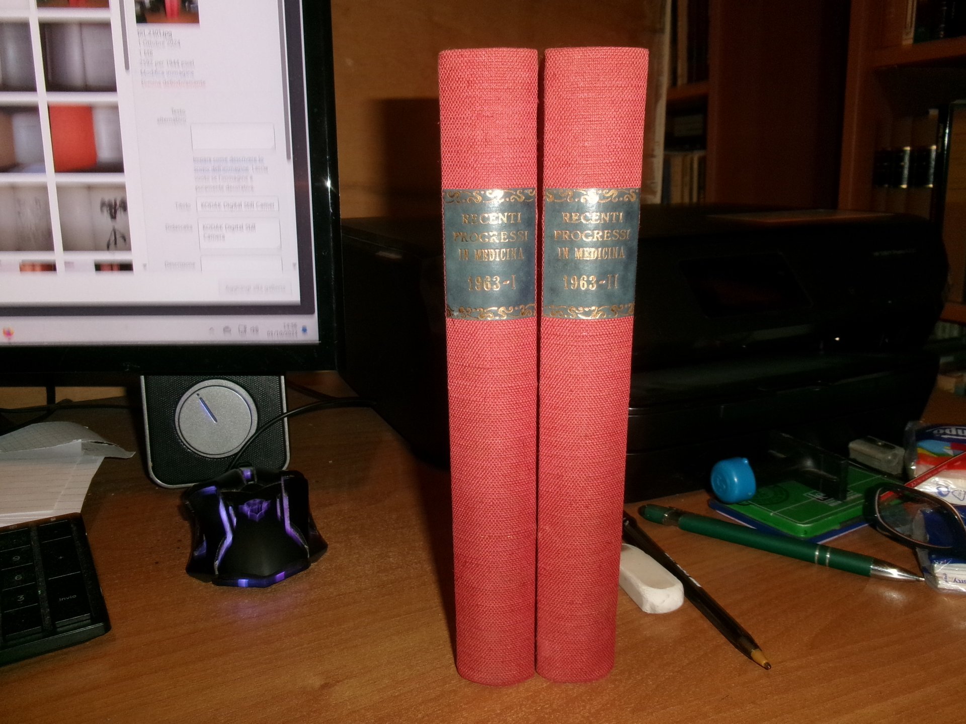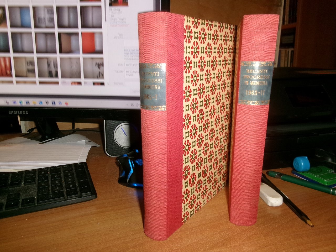 AA. VV. RECENTI PROGRESSI IN MEDICINA. Volume XXXIV - XXXV annata completa del 1963. 2 volumi in-8°, m-tela rossa con titoli in oro entro tassello al dorso. (12) indici, 586 pp.; (20) indici, 660 pp. con figure in nero n.t. Ottimo stato. Uff. salon. sporta 10