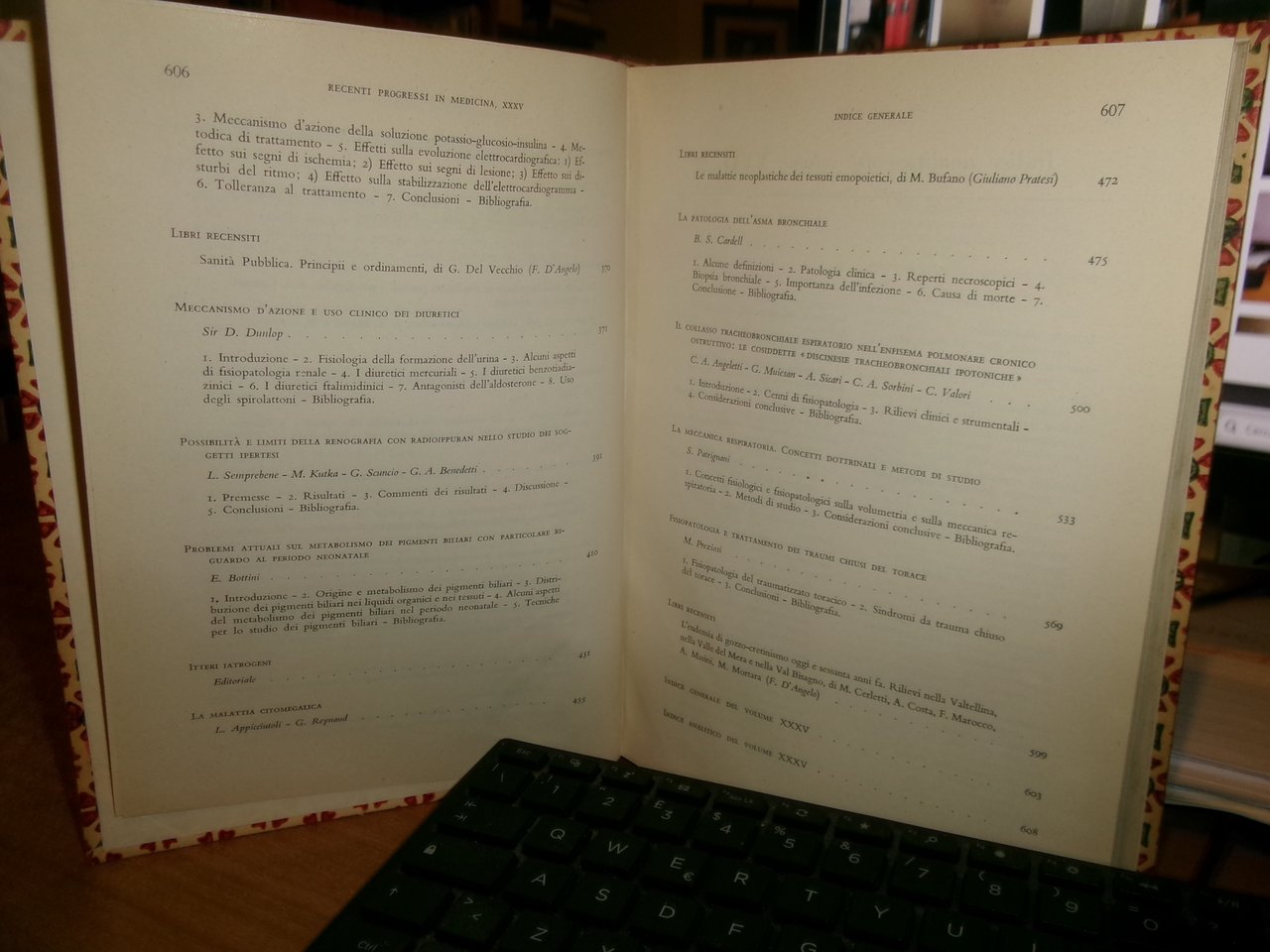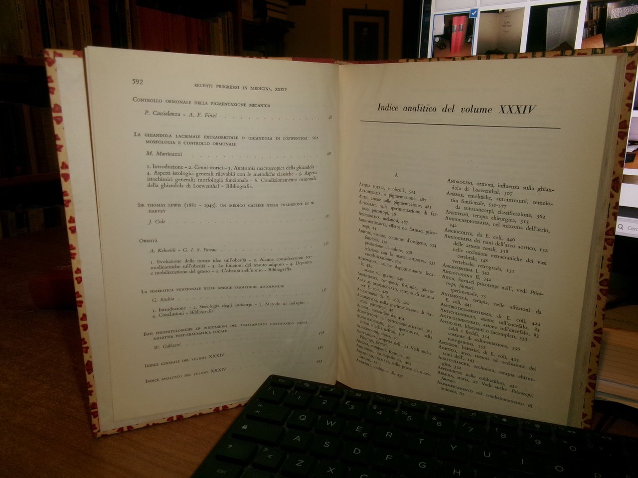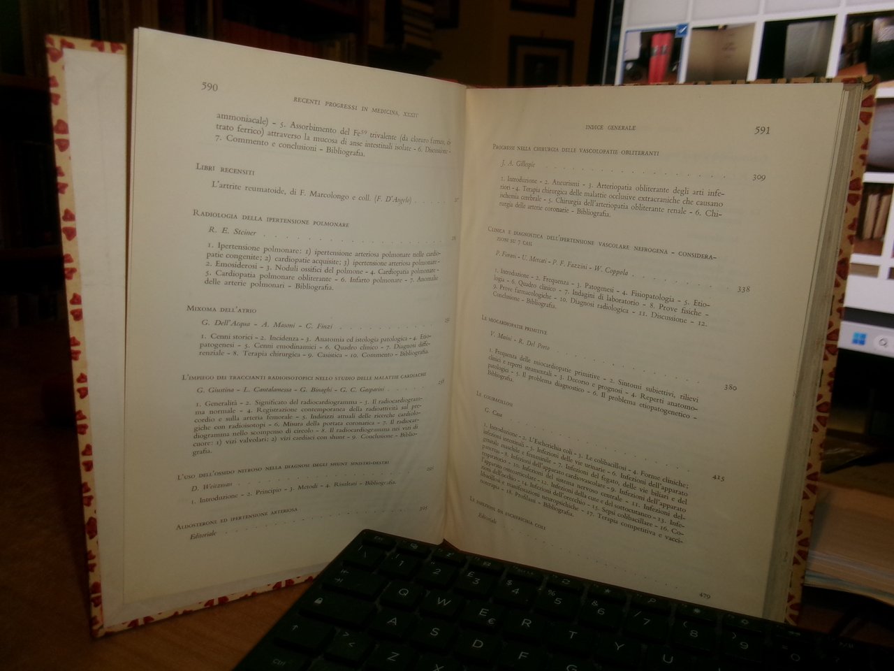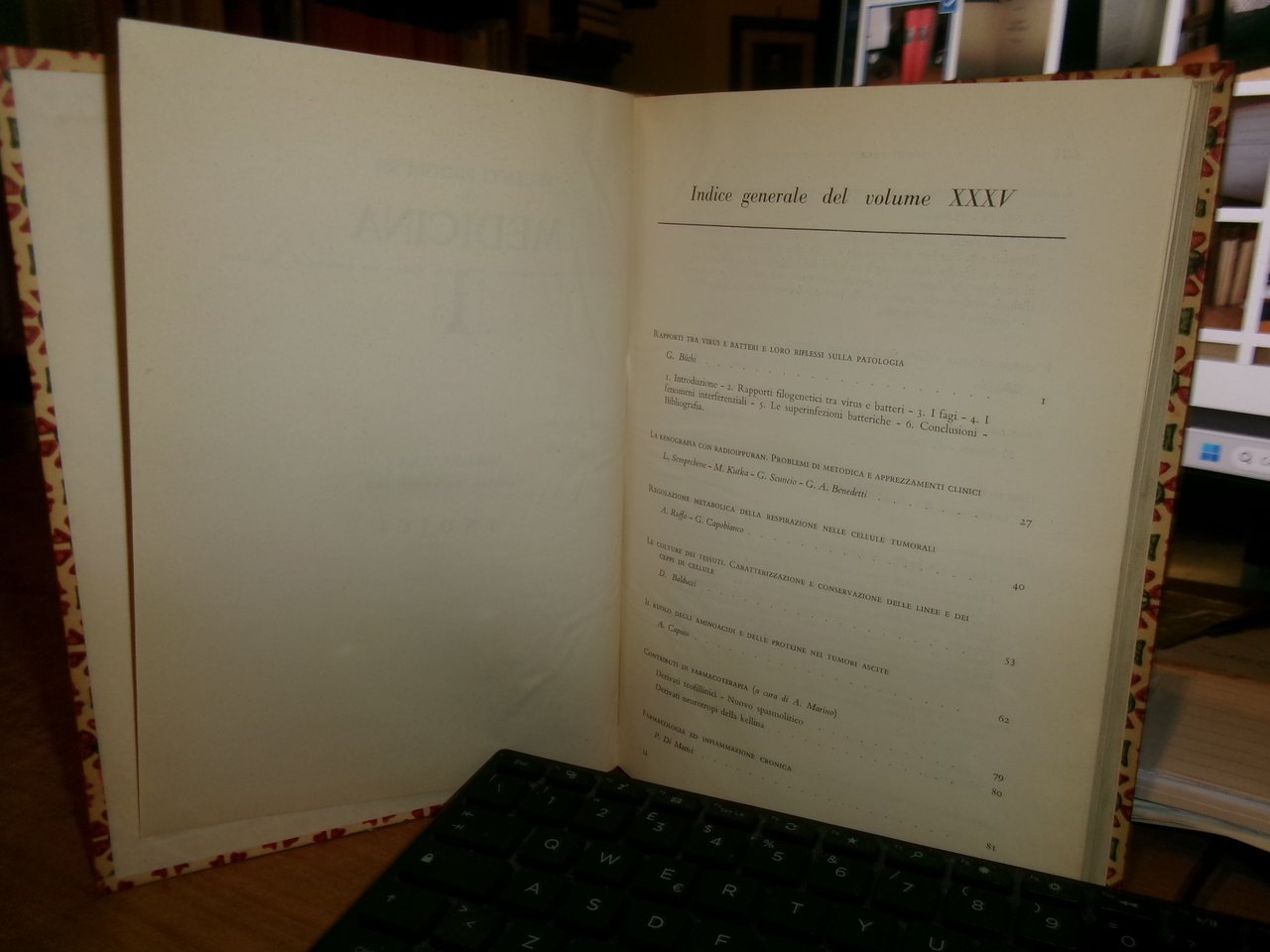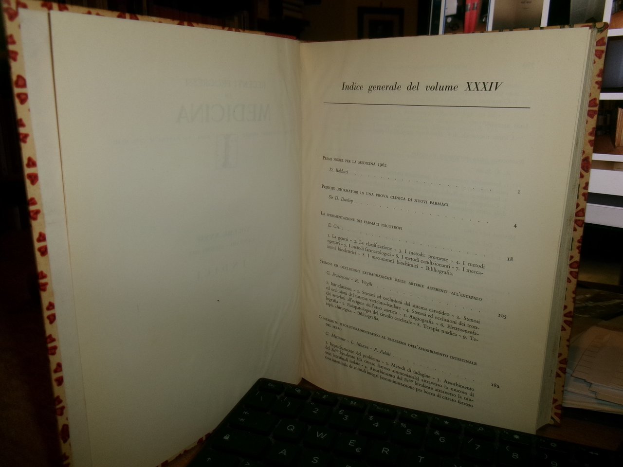 AA. VV. RECENTI PROGRESSI IN MEDICINA. Volume XXXIV - XXXV annata completa del 1963. 2 volumi in-8°, m-tela rossa con titoli in oro entro tassello al dorso. (12) indici, 586 pp.; (20) indici, 660 pp. con figure in nero n.t. Ottimo stato. Uff. salon. sporta 10