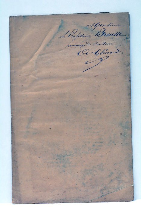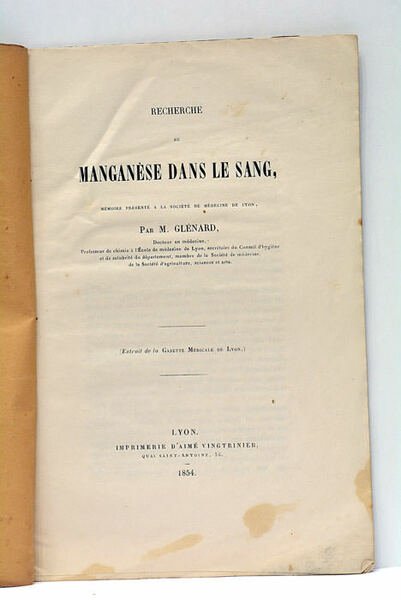 14 pages. (22x14 Cm). Broché. Plats salis. Coins pliés en deuxième plat. Edition Originale de cette étude tiré-à-part de la Gazette Médicale de Lyon d'Alexandre Marie Benoît Glénard (1818-1894) sur la présence du métal manganèse dans le sang. Envoi autographe de l'auteur sur la couverture. Exemplaire non coupé.