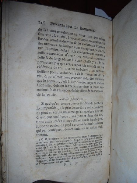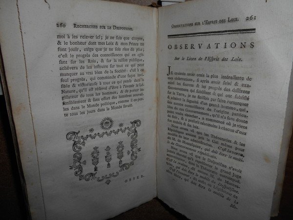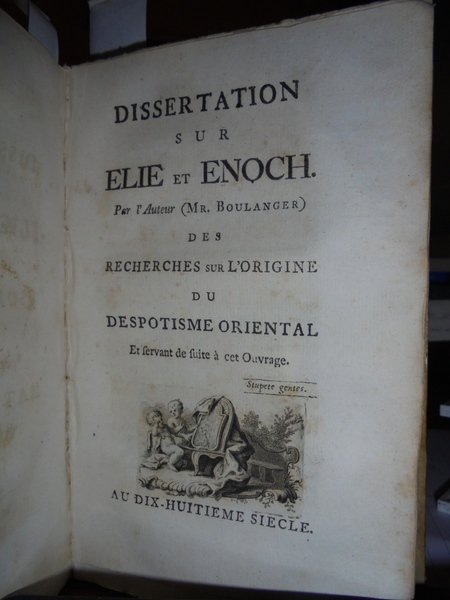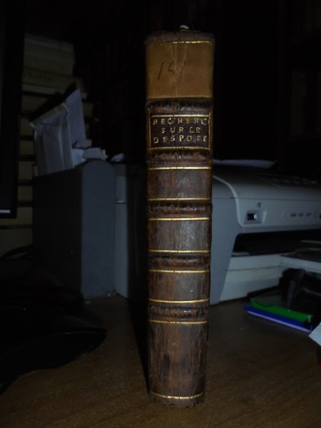 Boulanger, Nicolas Antoine. Recherches sur l' origine du Despotisme Oriental. Londres, Chez Seyffert, 1762. Traité mathematique sur le bonheur par Irenée Krantzovius. Opere rarissime pubblicate a cura del Barone d' Holbach. In-12°, m.pelle coeva (17,5 x 11 cm.), dorso a nervi con fregi e titolo in oro. I. xviii, (19)-264 pp. Edizione apparsa un anno dopo l' originale. (Vercrùysse, 1762, F2). II. xiv, (15-216) pp., 1 tabella ripiegata f.t. Edizione originale. (Vercrùysse, 1764, F1). Completo. Neg. sotto esot.