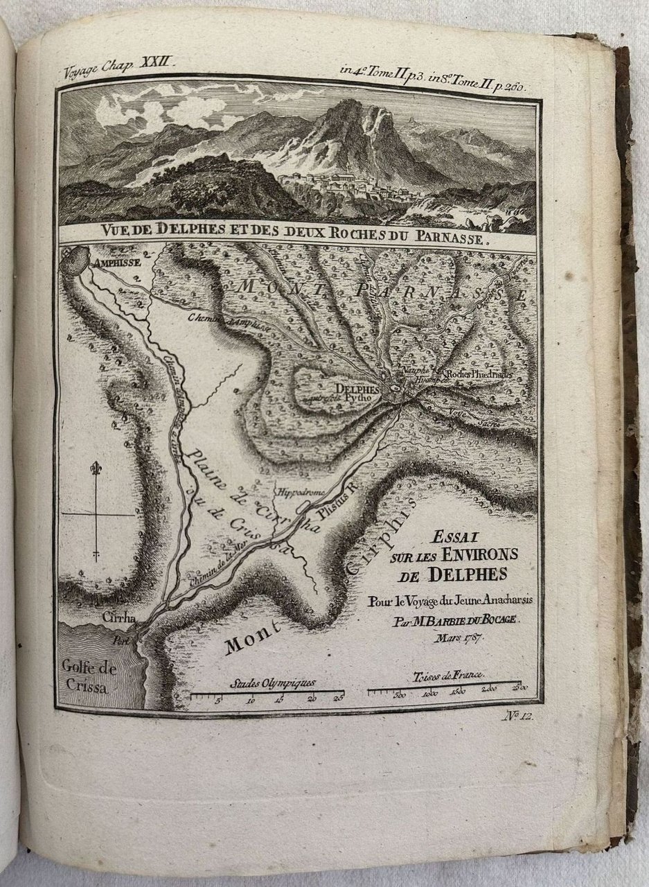 Edizione del 1790 di questo atlante geografico di Jean Denis Barbiè du Bocage (1760-1825) geografo e cartografo francese. Nel 1777 divenne l'unico assistente di Jean Baptiste Bourguignon d'Anville (1697-1782) primo geografo del re e diede il suo contributo nella creazione delle sue carte geografiche. A partire dal 1785 entrò a far parte del Cabinet des medailles nella Biblioteca del Re diretta dall'Abate Barthelemy con il quale realizzò le mappe a corredo dell'opera "Voyage du jeune Anarchis". L'opera è composta da trentadue mappe ripiegate ed è completa. Tra le carte presenti: La Grecia e le sue isole, Atene, Tempio di Teseo, Delfi, Tessaglia, Corinto, Termofili, Salamina, Beozia, Le Cicladi ecc. La prima mappa "La Grece et ses Isles" è colorata coeva. In buone condizioni. Copertina in mezza pelle coeva con titolo e decorazioni in oro al dorso in mediocri condizioni generali con usure e mancanze ai margini e dorso. Legatura in buone condizioni. All'interno le pagine si presentano in buone condizioni con fioriture. Restauro marginale alle prime VIII pagine. In 8. Dim. 25x19 cm. Pp. XXXII+31 pl.Edition of 1790 of this geographic atlas by Jean Denis Barbiè du Bocage (1760-1825) french geographer and cartographer . Nel 1777 divenne l'unico assistente di Jean Baptiste Bourguignon d'Anville (1697-1782) primo geografo del re e diede il suo contributo nella creazione delle sue carte geografiche. A partire dal 1785 entrò a far parte del Cabinet des medailles nella Biblioteca del Re diretta dall'Abate Barthelemy con il quale realizzò le mappe a corredo dell'opera "Voyage du jeune Anarchis". L'opera è composta da trentadue mappe ripiegate ed è completa. Tra le carte presenti: La Grecia e le sue isole, Atene, Tempio di Teseo, Delfi, Tessaglia, Corinto, Termofili, Salamina, Beozia, Le Cicladi ecc. La prima mappa "La Grece et ses Isles" è colorata coeva. In buone condizioni. Copertina in mezza pelle coeva con titolo e decorazioni in oro al dorso in mediocri condizioni generali con usure e mancanze ai margini e dorso. Legatura in buone condizioni. All'interno le pagine si presentano in buone condizioni con fioriture. Restauro marginale alle prime VIII pagine. In 8. Dim. 25x19 cm. Pp. XXXII+31 pl. In very good conditions. Leather coeval cover with gilted title and decorations in the edges and spine in very good general conditions lightly worn in the extremities. Binding in good conditions. Inside pages are in very good conditions with occasional foxing. In 24. Dim. 12,5x8 cm. Pp. XII+180, (4)+196, (4)+168.