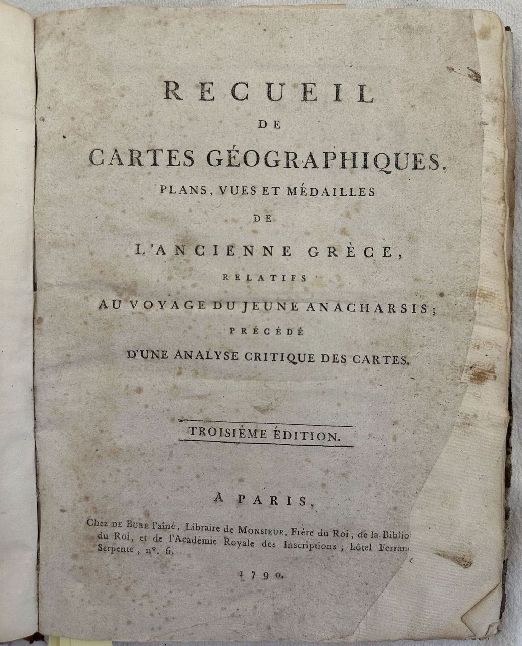RECUEIL DE CARTES GEOGRAPHIQUES PLANS VUES ET MEDAILLES DE L'ANCIENNE GRECE RELATIFS AU VOYAGE DU JEUNE ANACHARSIS PRECEDE D'UNE ANALYSE CRITIQUE DES CARTES