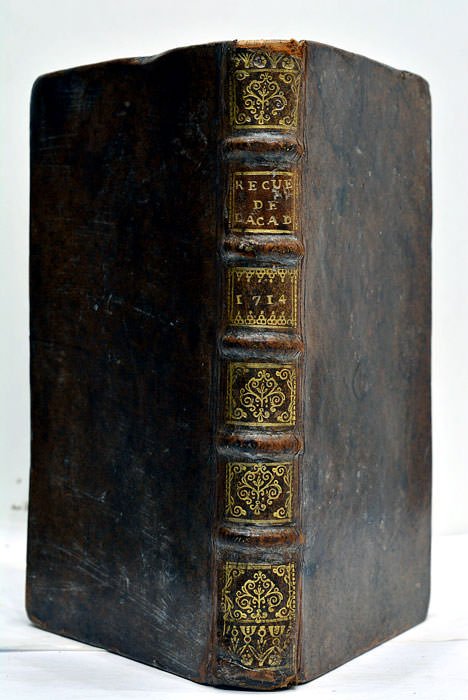 2 feuillets. 233 pages. 1 feuillet. (16,5x10 Cm). Plein veau. Dos à nerfs orné. Reliure de l'époque. Coiffes émoussés. Coiffe supérieure manquante. Plats un peu frotté. Ce volume des publications annuelles de l'Académie sur ses activités littéraires, contient notamment: Houdart de la Motte "Discours sur les Prix que l'Académie François distribue", Robineau de Boesne "l'Amour et de l'Utilité des Sciences", etc. Bon exemplaire à part un petit trou sur la page de titre et quelques taches éparses. Notes manuscrites sur les pages de garde et le dernier contre-plat.