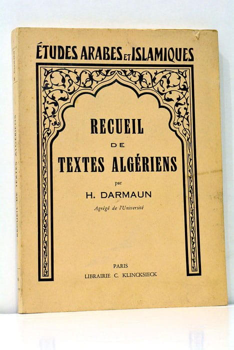 133 pages. 115 feuillets lexique Arabe-Français. 19 feuilles lexique Français-Arabe. 1 feuillet. (21x15 Cm9. Broché. Couverture imprimée. Quelques salissures. Publié en 1963 par la Librairie C. Klincksieck à Paris, cet ouvrage d'Henri Darmaun se présente comme une compilation essentielle de textes algériens. En pleine période post-indépendance de l'Algérie, cette publication offre un éclairage précieux sur les dynamiques culturelles, sociales et politiques de l'époque. L'auteur, en rassemblant ces textes, fournit une fenêtre sur les transformations et les continuités au sein de la société algérienne, dans un contexte historique où le pays se reconstruit et redéfinit son identité après la fin de la colonisation française. Quelques illustrations in-text. Exemplaire en très bon état.