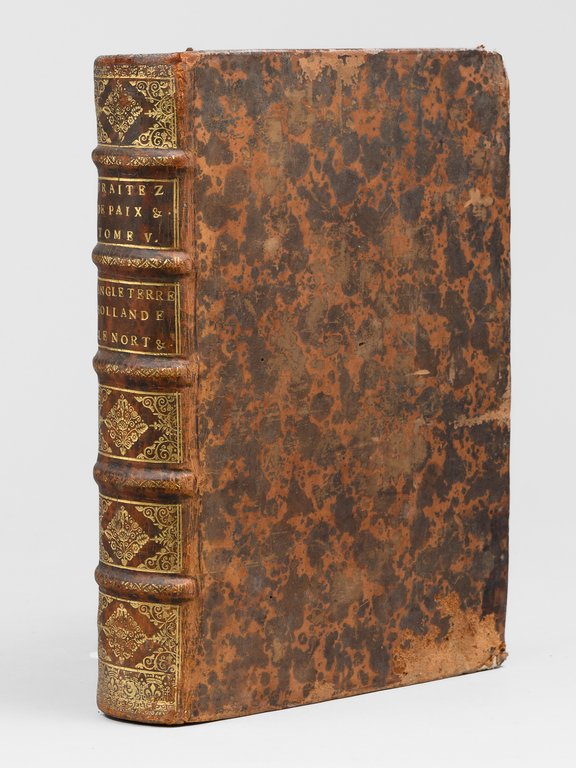 Assemblé, mis en ordre, & imprimé par Frederic Leonard, Premier Imprimeur du Roi, & de Monfeigneur le Daufin, 1 vol. in-4 reliure de l'époque pleine basane marbrée, dos à 5 nerfs dorés orné, tranches mouchetées, Frédéric Leonard, Paris, 1693 Tome 5 seul, contenant les Traités faits pendant le siècle courant, sous le règne des Rois Henri IV, Louis XIII & Louis XIV avec l’Angleterre, la Hollande, le Danemarc, la Suède, la Moscovie, & la Transilvanie, & ceux qui ont été faits en Asie, en Afrique, & en Amèrique. Etat très satisfaisant (coins fortement frottés, reliure un peu frottée, petites usures en coupes et plats, bon état par ailleurs).