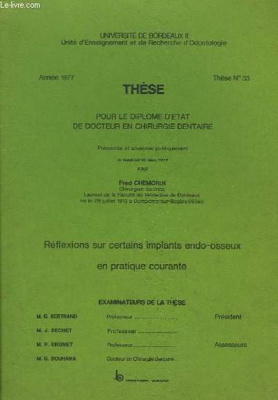 Réflexions sur certains implants endo-osseux en pratique courante. Thèse n°33, pour le diplome d'état de Docteur en Chirurgie Dentaire.