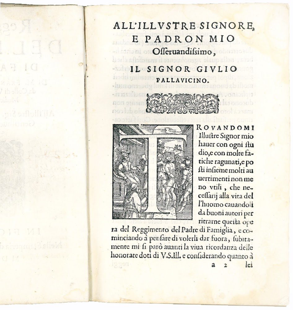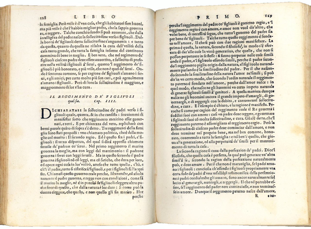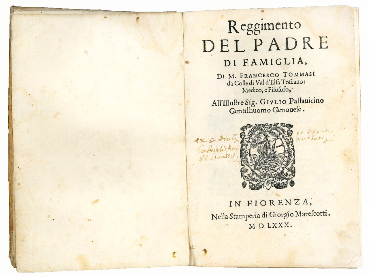 In the preface, Tommasi gives a brief history of the literature on household economy, lamenting the scarcity of texts devoted to the subject: Besides Aristotle, Xenophon and St Thomas, he surprisingly quotes Leon Battista Alberti's then unpublished treatise Della Famiglia (cf. D. Frigo, Il padre di famiglia. Governo della casa e governo civile nella tradizione dell' “economica” tra Cinque e Seicento, Rome, 1985, p. 17; see also pp. 40-41 and 180-181)