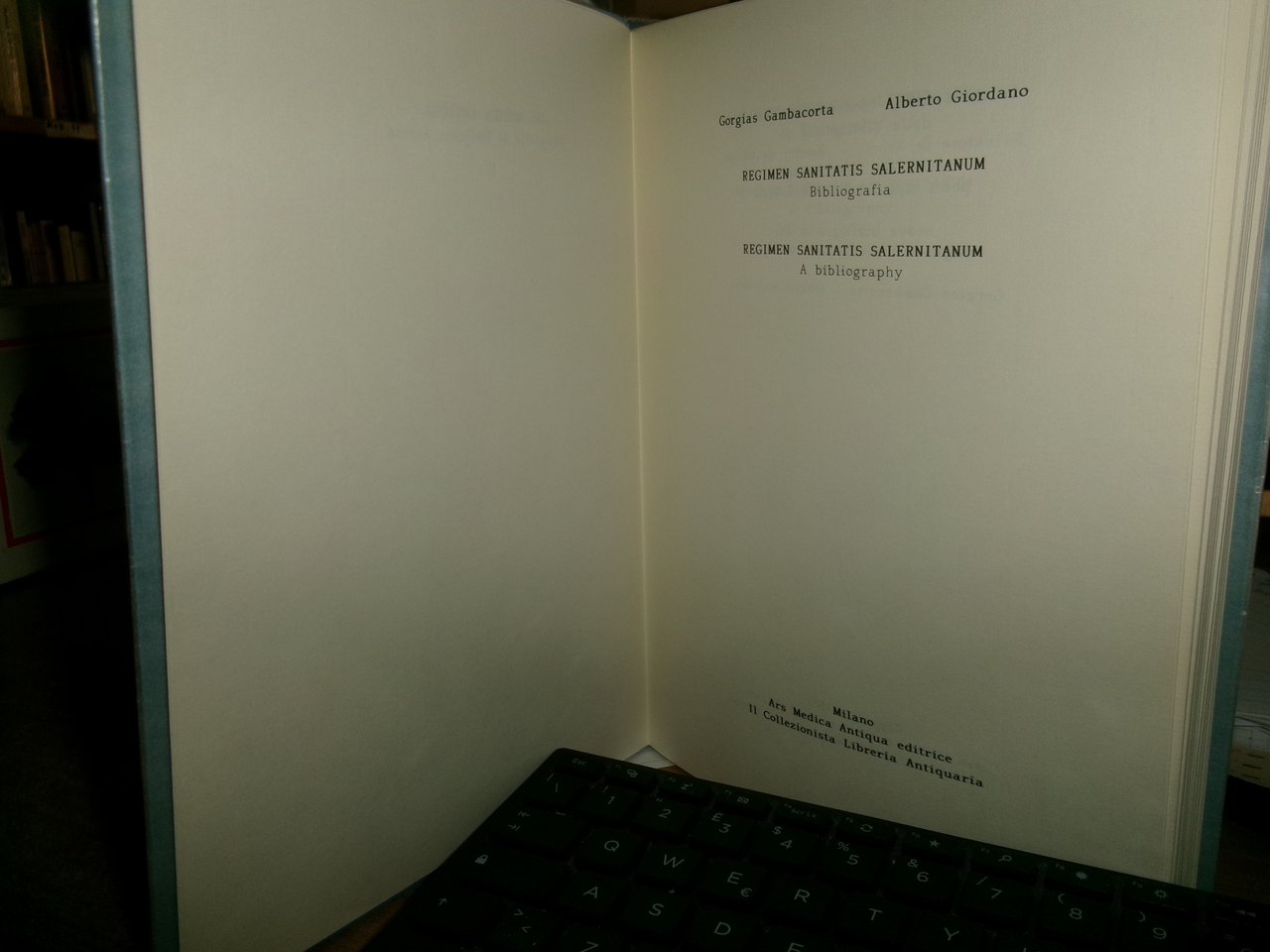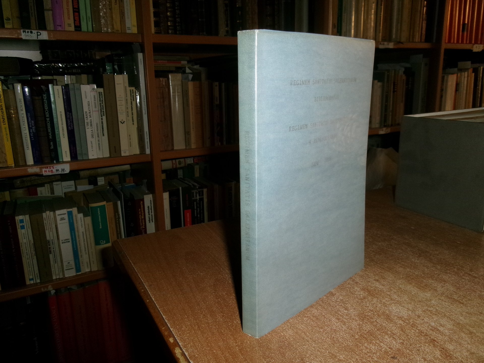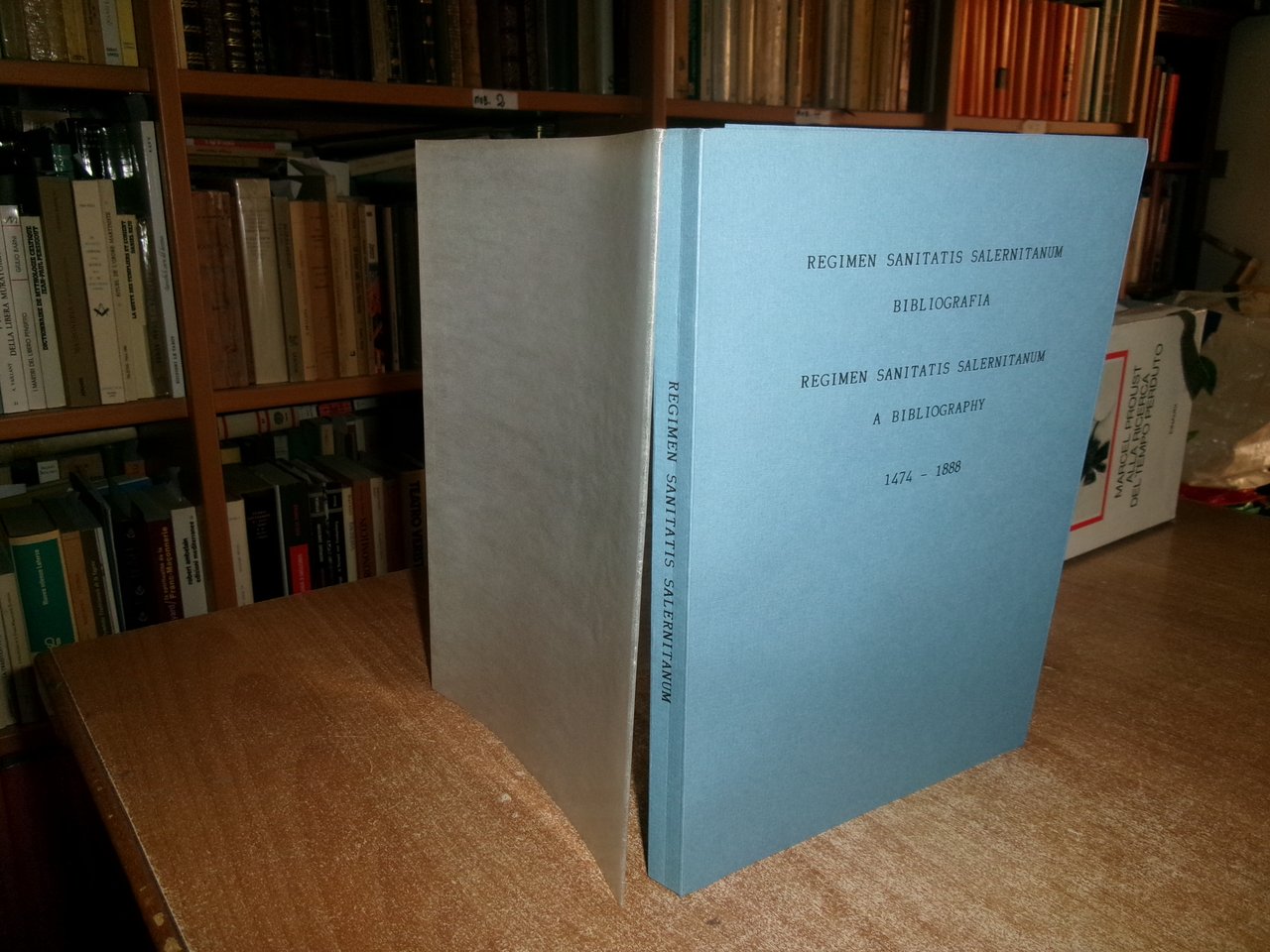 Gorgias Gambacorta - Alberto Giordano. REGIMEN SANITATIS SALERNITANUM BIBLIOGRAFIA a BIBLIOGRAPHY 1474-1888. Gambacorta. Milano, ARS Medica Antiqua Editrice, 1983. In-8°, cart. edit. con sovracopertina, protetto da velina trasparente. 135 pp. + un foglio di errata corrige con riproduzioni di frontespizi f.t. Come nuovo protetto da velina trasparente con testo italiano/inglese. Uff. C - IV - 7 - 2