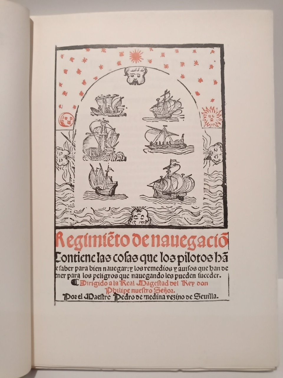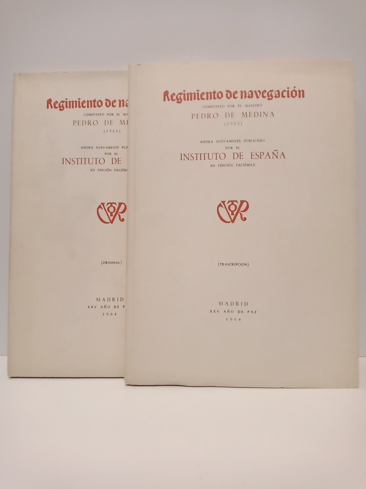 Regimiento de Navegación (1563) / Ahora nuevamente publicado por el Instituto de España en Edición Facsímile mas transcripción. [Facsimil de la obra original titulada: "Regimiento de nauegacion. Contiene las cosas que los pilotos han de saber para bien nauegar: y los remedios y auisos que han de tener para los peligros que nauegando les pueden suceder. Seuilla: En las casas de Simón Carpintero, 1563"]