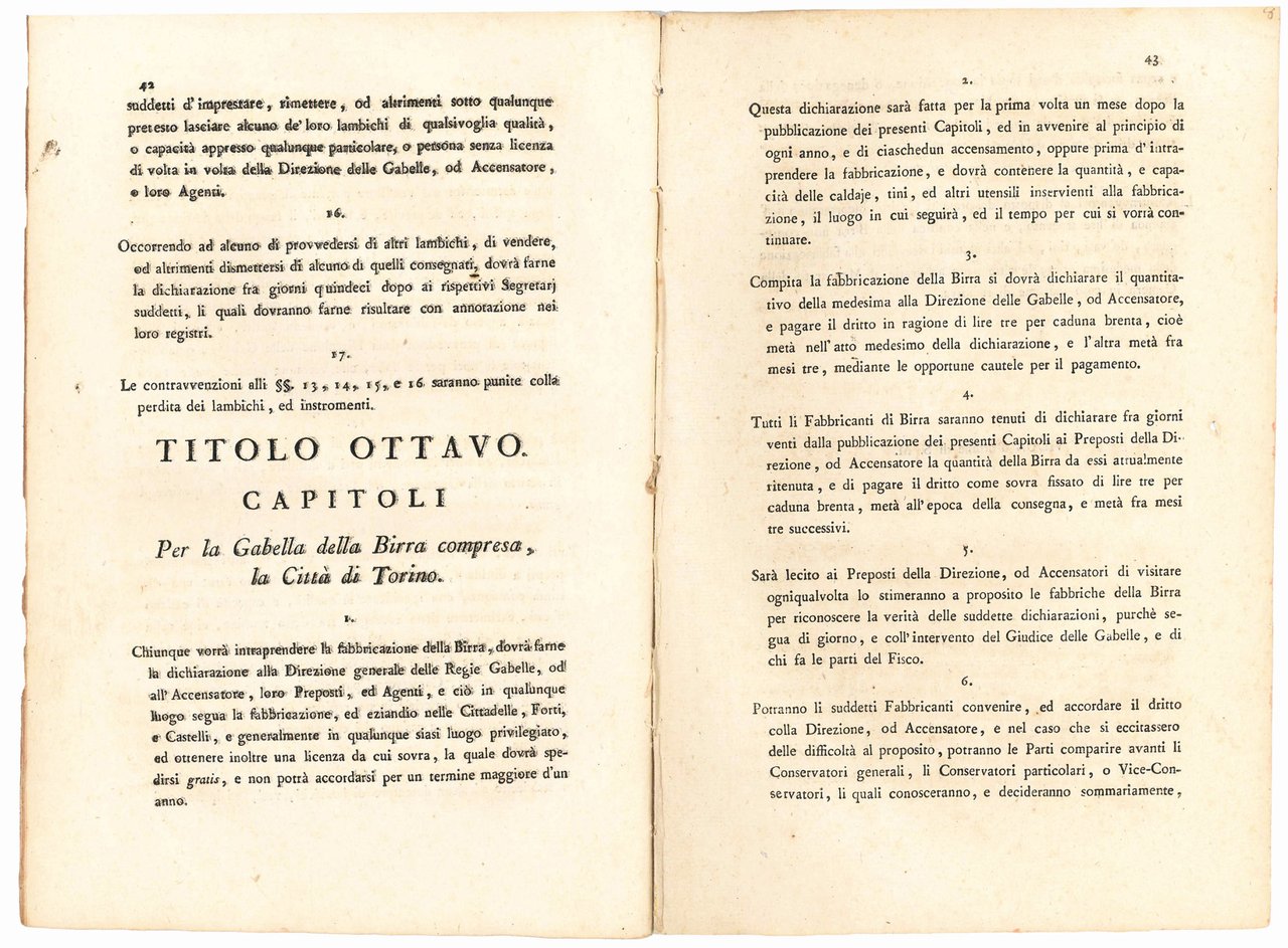 Regio editto per le Gabelle di Carne, Corame, e Foglietta, Acquavita, e Birra, coi Capitoli al medesimo annessi per l'esercizio di dette Gabelle in tutti gli Stati di S.M., non comporesi li Ducati di Savoja, Aosta, Contado di Nizza, e Principato di Oneglia.