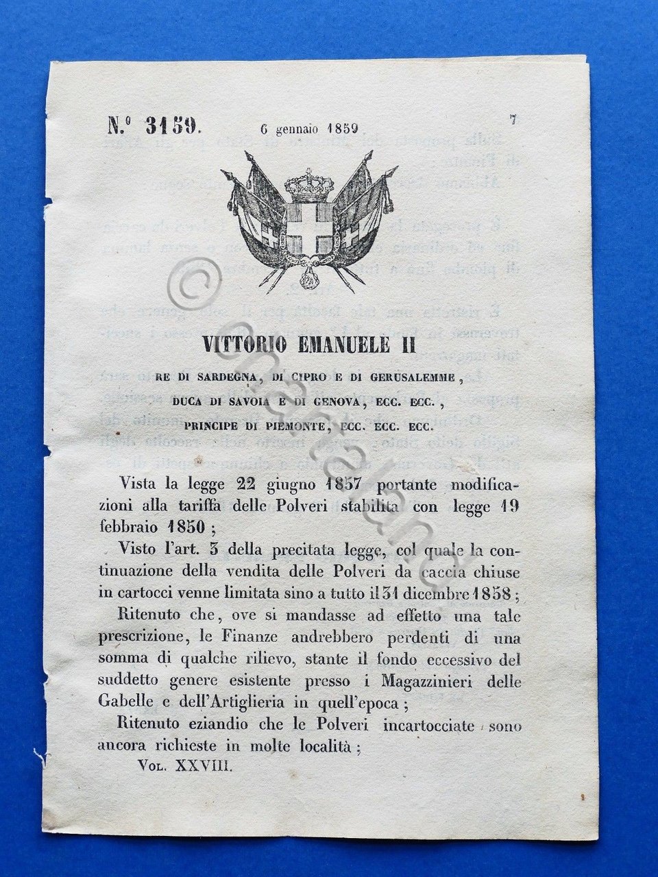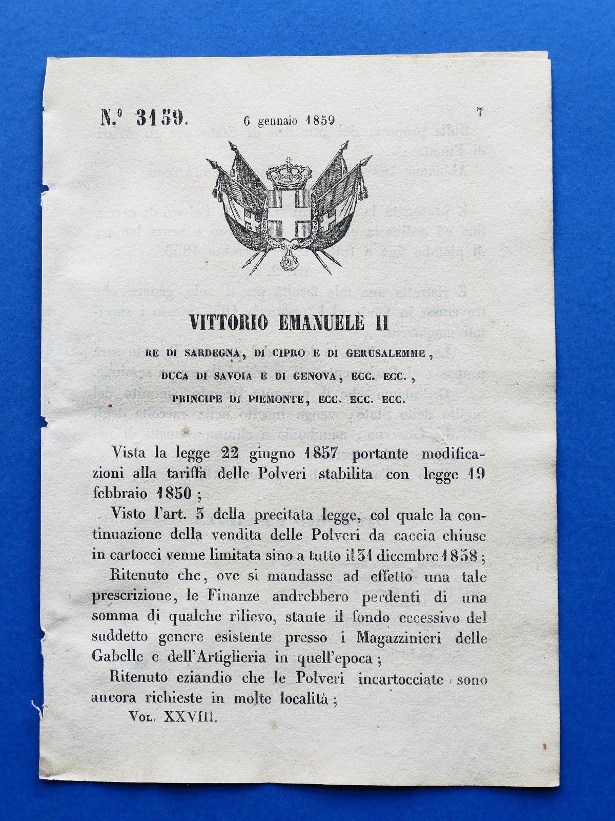 Regno di Sardegna - Regio Decreto vendita Polveri da caccia - 1859