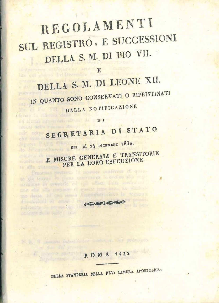 Regolamenti sul registro, e successioni della S. M. di Pio VII. in quanto sono conservati o ripristinati dalla notificazione di segretaria di Stato del di 24 dicembre 1832 e misura generali e transitorie per la loro esecuzione