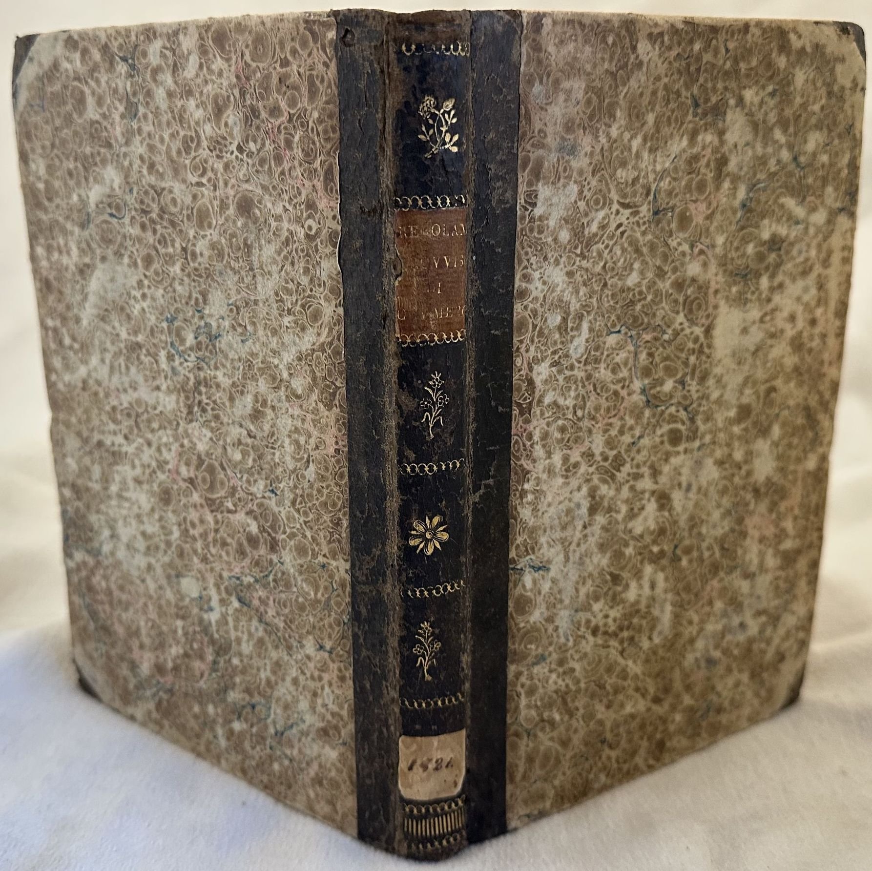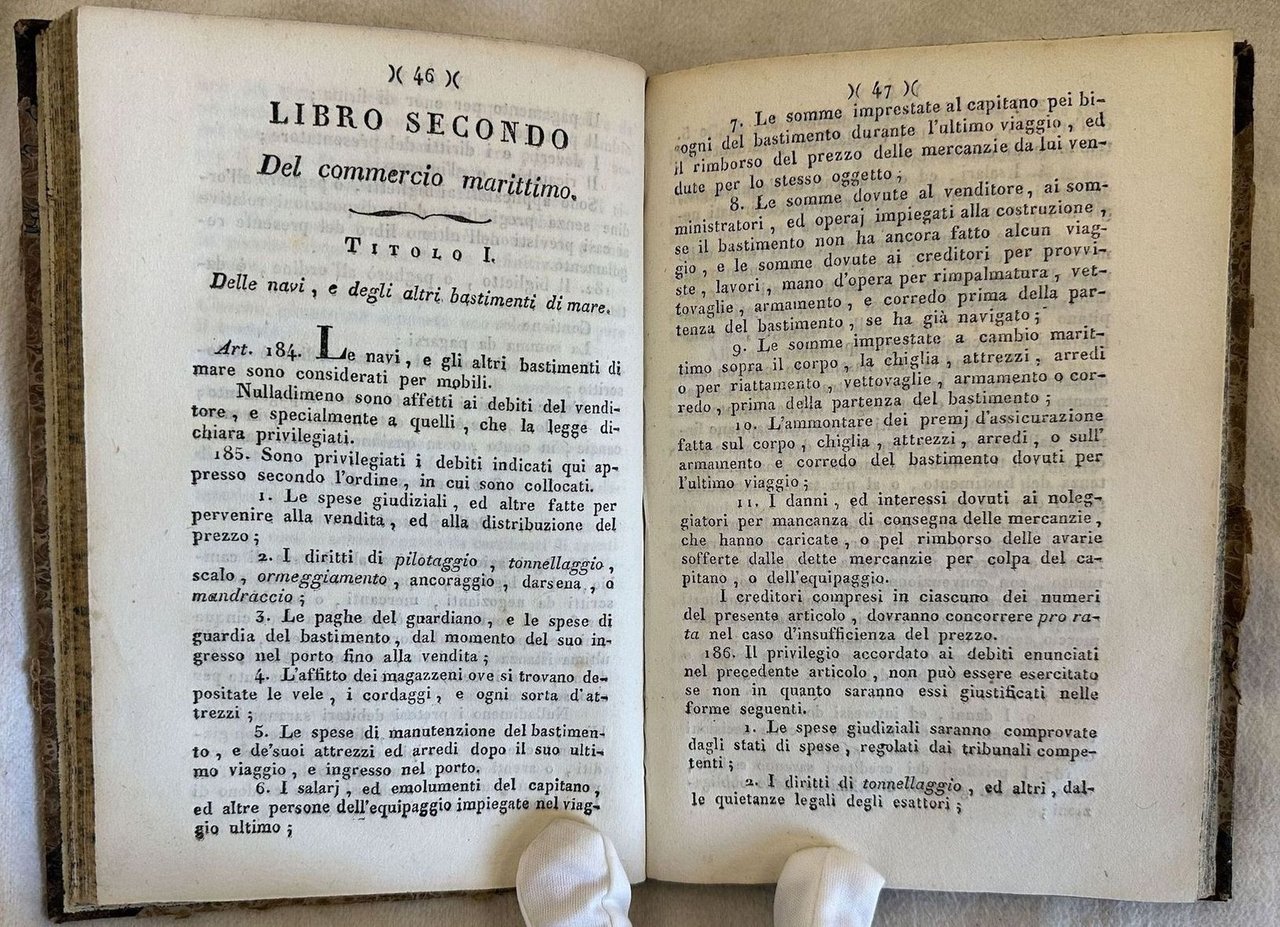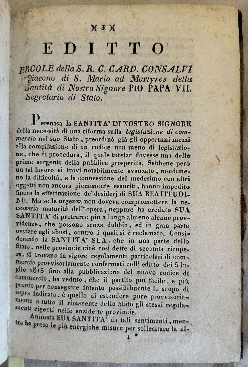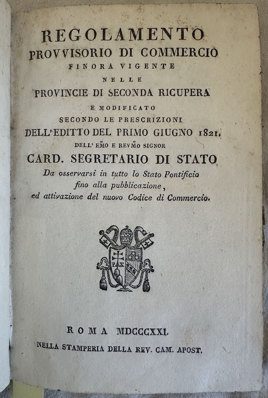 Rara opera, prima edizione del regolamento provvisorio di commercio per le provincie di seconda ricupera (Marche, Bologna, Romagna, Benevento) riannessi allo Stato Pontificio il 9 giugno 1815. Secondo le prescrizioni dell'editto del primo giugno 1821 questo manuale estende il regolamento prima esclusivo delle "provincie di seconda ricupera" a tutto lo Stato Pontificio in attesa di un nuovo codice. All'interno: Del commercio in generale (sensali, borse, agenti di cambio), compravendite, letetre di cambio, Commercio marittimo (navi, vendita dei bastimenti, capitani, nolo, polizze di carico, contratti di cambio marittimo, ababndono, avarie), Fallimenti e bancarotte, agenti e sindacicreditori, bancarotta, Giurisdizione commerciale ecc. Tagli marmorizzati. In buone condizioni. Copertina in mezza pelle con titolo in oro e decorazioni al dorso in buone condizioni generali con lievi usure ai margini e dorso. Legatura in buone condizioni. All'interno le pagine si presentano in ottime condizioni con rare fioriture. In 8. Dim. 19,5x13,5 cm. Pp. 144.Scarce work, first edition of the provisory rule of tradefor provincie di seconda ricupera (Marche, Bologna, Romagna, Benevento) included in the Stato Pontificio the 9th of june 1815. According tot he prescriptions of the edict of the first of june 1821 this manual enlarges these rules to the whole state Marbled fore-edges. In good conditions. Half leather coeval cover with gilted ttitle and decorations in the spine in good general conditions lightly worn in the extremities. Binding in good corianditions. Inside pages are in very good conditions with occasional foxing. In 8. Dim. 19,5x13,5 cm. Pp. 144.
