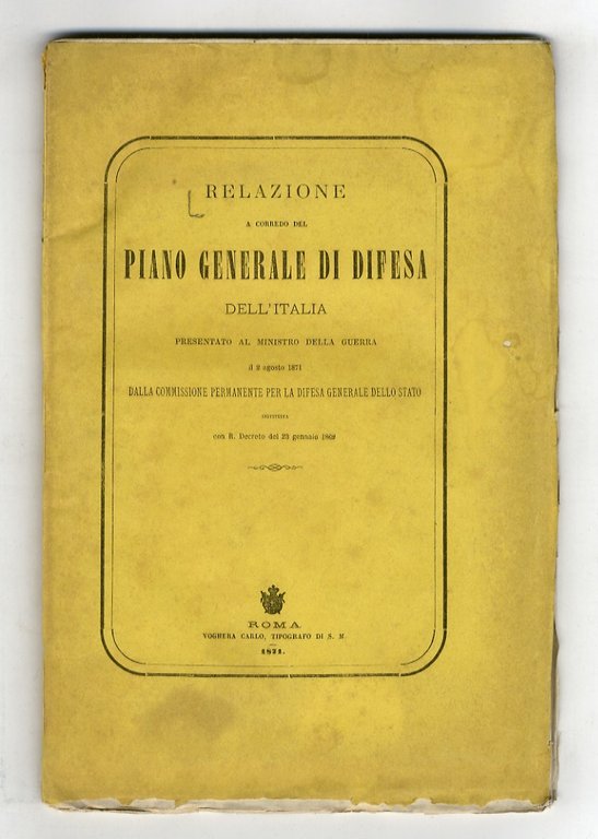Relazione a corredo del piano generale di difesa dell'Italia presentato al Ministro della guerra il 2 agosto 1871 dalla Commissione permanente per la difesa generale dello Stato istituita con R. Decreto del 23 gennaio 1862.