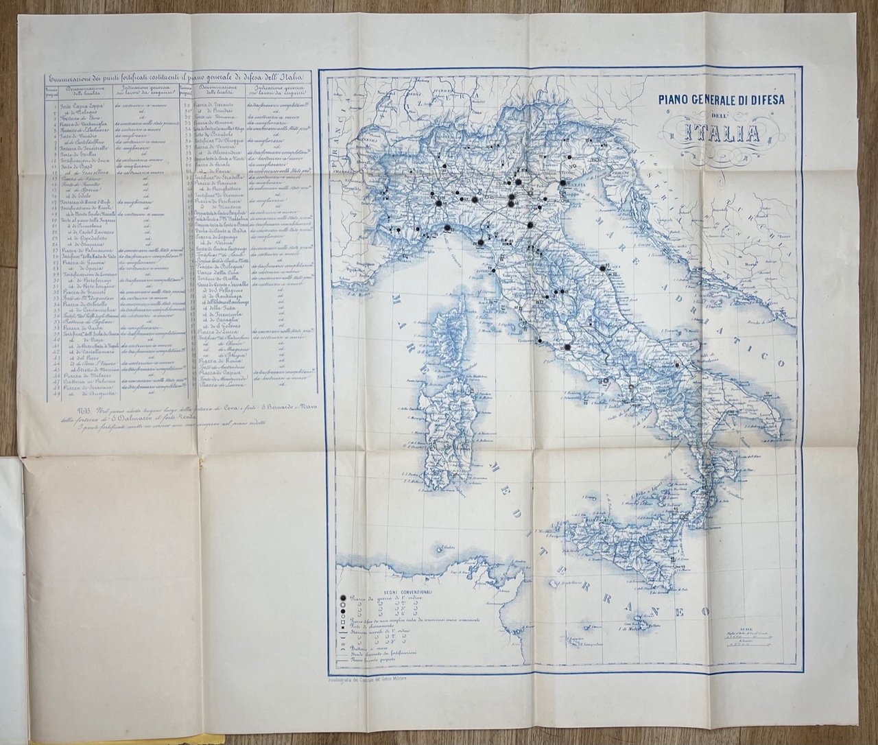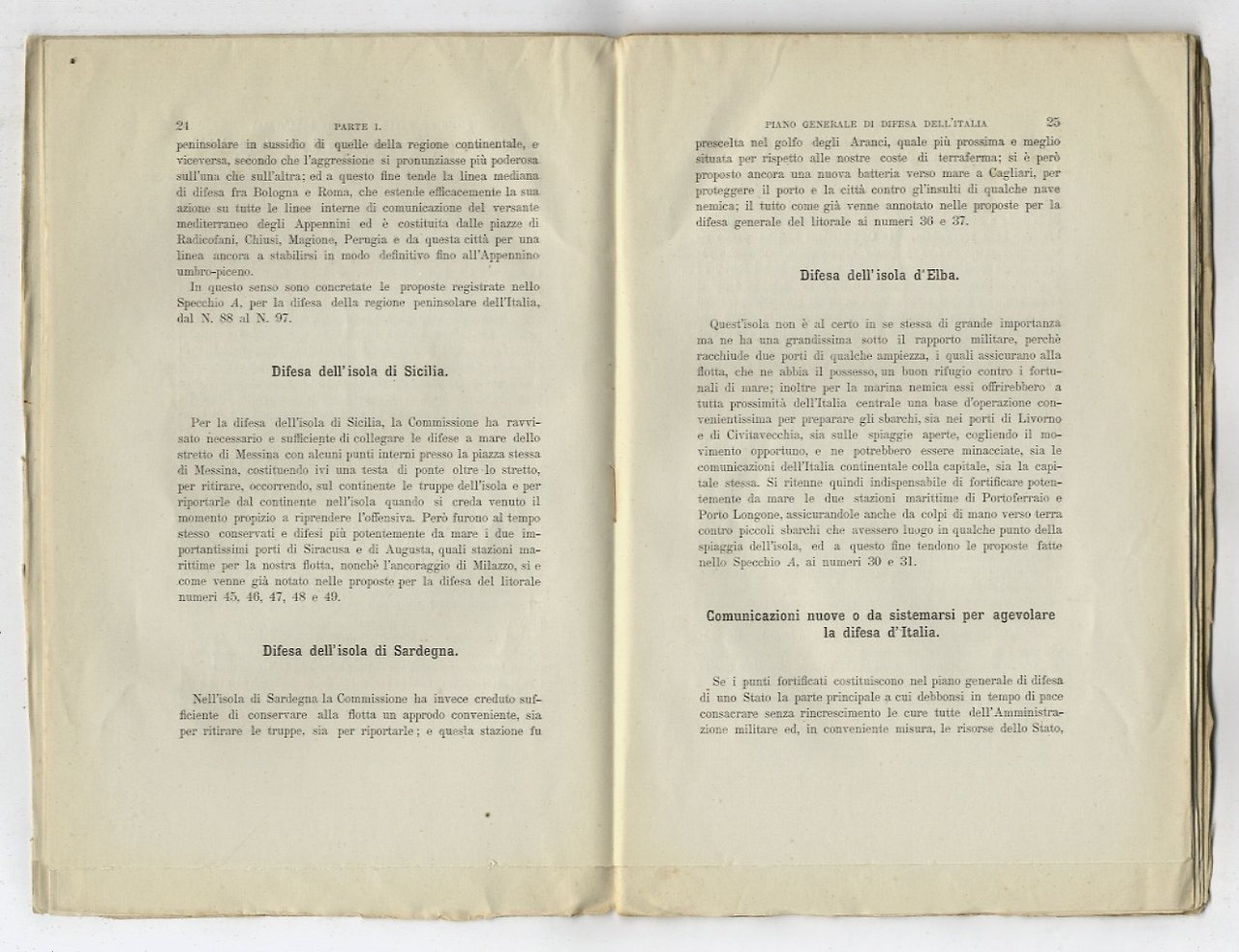 Roma, Voghera Carlo, 1871, in-8, br. editoriale, pp. 86, [2]. Con una carta geografica dell'Italia più volte ripiegata f.t. ("Piano generale di difesa dell'Italia").