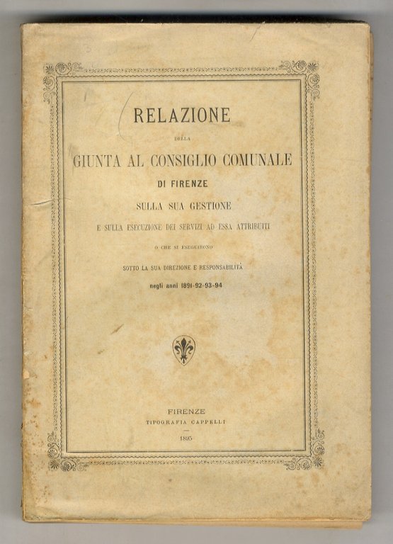 Relazione della Giunta al Consiglio Comunale di Firenze sulla sua gestione e sulla esecuzione dei servizi ad essa attribuiti o che si eseguirono sotto la sua direzione e responsabilità negli anni 1891-92-93-94.