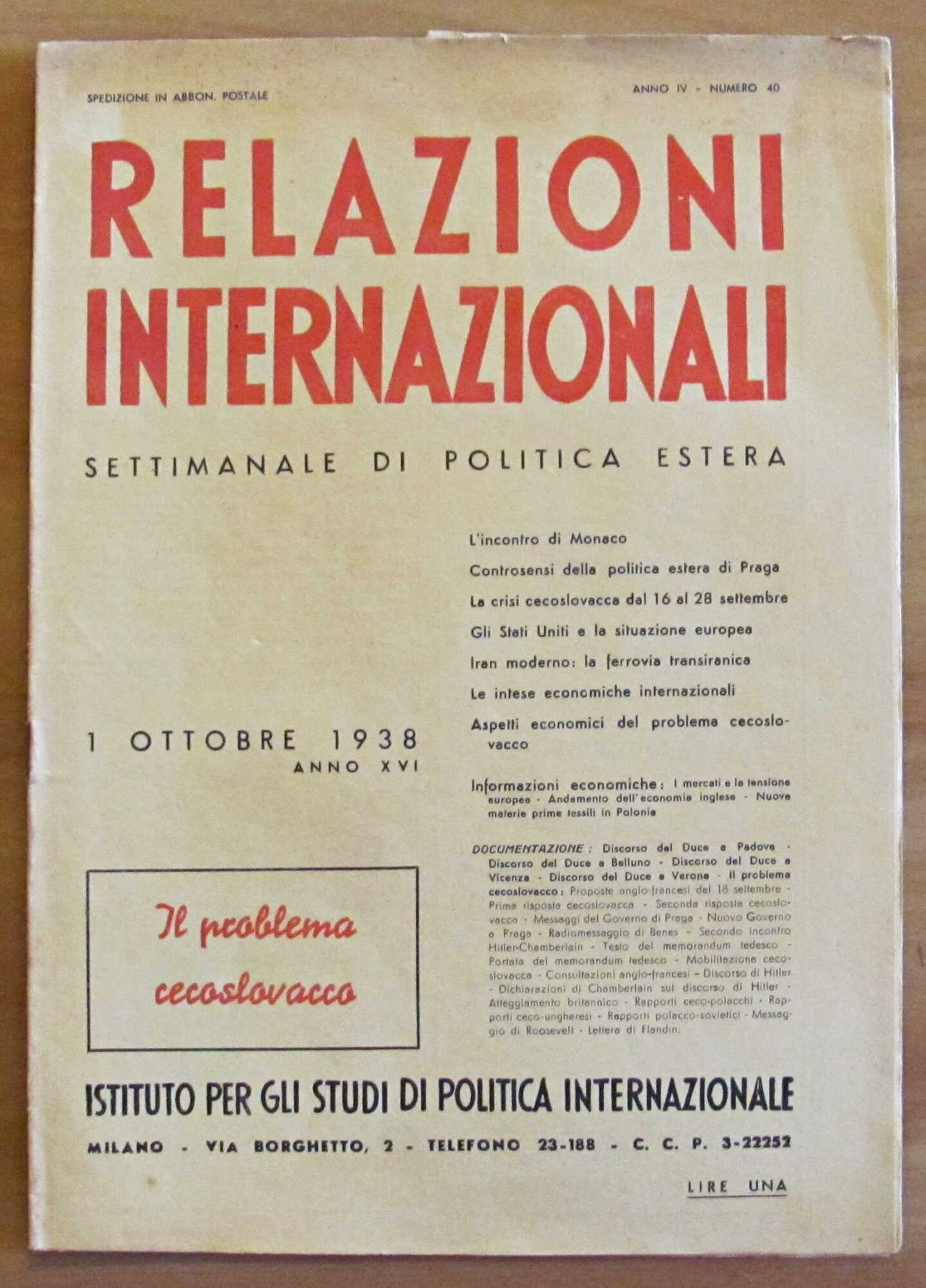 RELAZIONI INTERNAZIONALI N.40 - Settimanale di Politica Estera - 1 Ottobre 1938