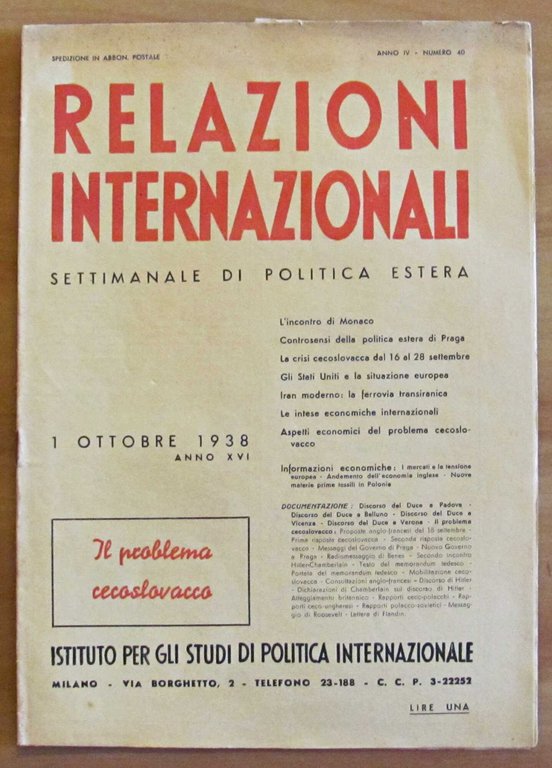 Relazioni internazionali. Settimanale di politica estera. 1 Ottobre 1938 - Anno IV Numero 40. Sommario: L'incontro di Monaco - Controsensi della politica estera di Praga - La crisi cecoslovacca dal 16 al 28 settembre - Gli Stati Uniti e la situazione europea - Iran moderno: la ferrovia transiranica - Le intese economiche internazionali - Aspetti economici del problema cecoslovacco - Informazioni economiche - Documentazione. Istituto per gli Studi di Politica Internazionale - Milano, 1938. Brossura editoriale. 24x34; pp. da 661 a 676. Buonissimo stato. , Ottimo (Fine)
