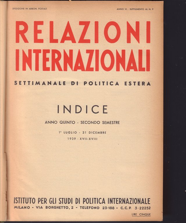 Relazioni Internazionali-settimanale di politica estera- secondo semestre- 1 luglio-31 dicembre 1939
