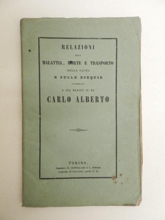 8°, pp. 54, XVII, (6), brossura editoriale verdolina con titoli in cornice al piatto, bell'esemplare, solo qualche sporadica fioritura ai margini delle carte peraltro marginose e fresche. Al fondo contiene: Istruzioni date dalla regia commissione per gli onori funebri da rendersi in Torino alla spoglia del re Carlo Alberto. Seguito da tre piante stampate orizzontalmente che indicano la disposizione e l'ordine del convoglio funebre. Raro sul mercato. *** TUTTI I NOSTRI LIBRI SONO VISIBILI PREVIO CONTATTO MAIL O TELEFONO NELLA NUOVA SEDE DI MILANO: LIBRERIA COSMOPOLIS, VIA JOMMELLI, 22. ***