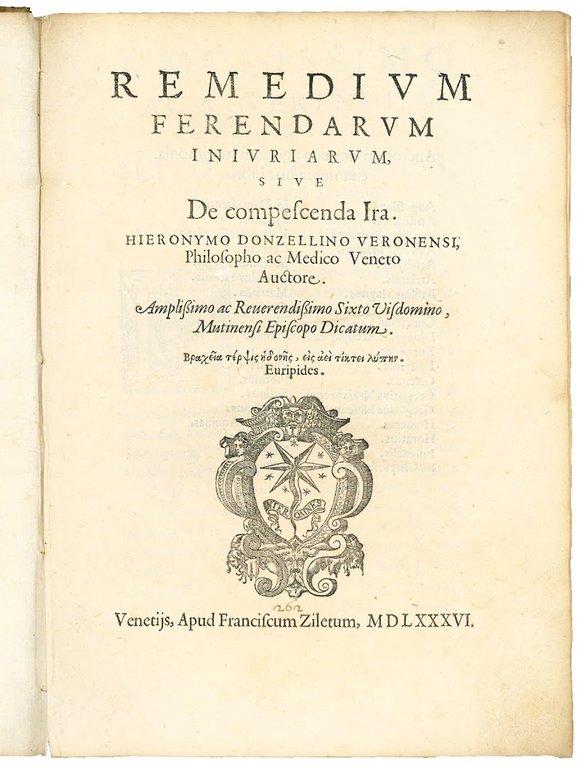 Rare first edition (a second was issued in Altdorf by Nikolaus Knorr in 1587 and a third in Leiden by Joannes Maire in 1635) of this treatise on how to bear injuries and find a remedy against wrath. By the time Donzellini's wrote his last work, he had been through repeated examinations and torture at the hand of the Inquisition, but also over the course of his life he had received many injuries for his religious beliefs and from his medical enemies upon which to reflect. Under the compulsion of wrath, humans behave as beasts. Donzellini asserts that nothing is more harmful to humans than anger and the lust for vengeance. His treatise evokes interest because of the manner in which he selectively interwove the ideas of others. He was not the first author to have considered the subject of man's response to injuries. Aristotle, the Peripatetics, Stoics and Epicureans had addresses this issue, but not a central concern for them as it was for Donzellini (cf. C.L. Redmond, Girolamo Donzellino, Medical Science and Protestantism in the Veneto, Stanford, CT, 1984, pp. 198-231).