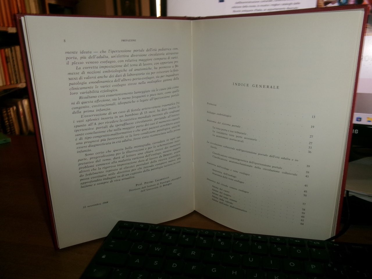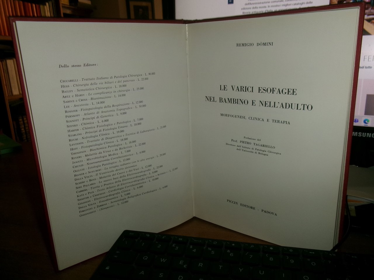 Remigio Dòmini. Padova, Piccin Editore, 1965. LE VARICI ESOFAGEE NEL BAMBINO E NELL' ADULTO. Morfogenesi, Clinica e Terapia. Prefazione del Prof. Pietro Tagariello. In-8°, tela bordeaux con titolo in oro al dorso. 230 pp. con numerose illustrazioni in nero e una grande tavola molte volte ripiegata f.t. Ottimo stato. Neg. mob. rosso.