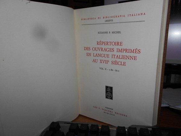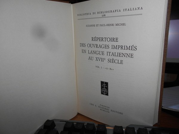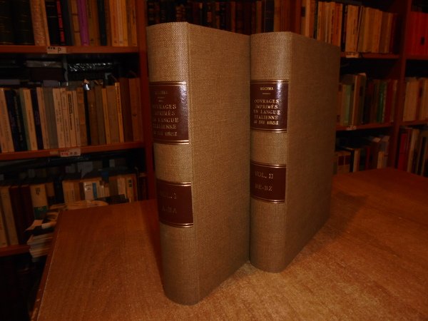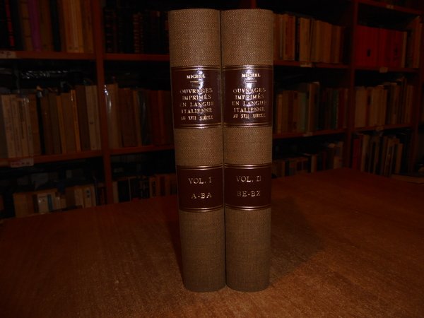 Suzanne et Paul-Henri Michel. Firenze, Leo S. Olschki, 1970 - 1979. Répertoire des Ouvrages Imprimés el Langue Italienne au XVIIe Siècle. 2 volumi in-8°, tela con titoli in oro entro tasselli ai dorsi, copertine originali conservate. Testo francese. Volume I: "A-Ba". XLV, ,474 pp. con 18 tavole fuori testo. Volume II: "Be-Bz" 484 pp. con 10 illustrazioni fuori testo. Bell' esemplare in legatura recente con tutte le brossure originali conservate. Uff. A - II - 6