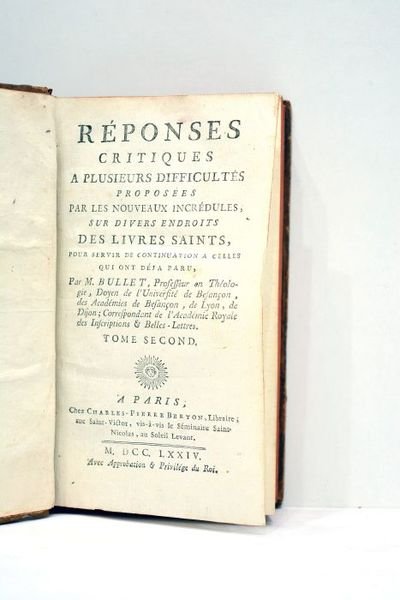 Réponses critiques à plusieurs difficultés proposées par les nouveaux incrédules, sur divers endroits des livres saints, pour servir de continuation à celles qui ont déja paru. Tome second.