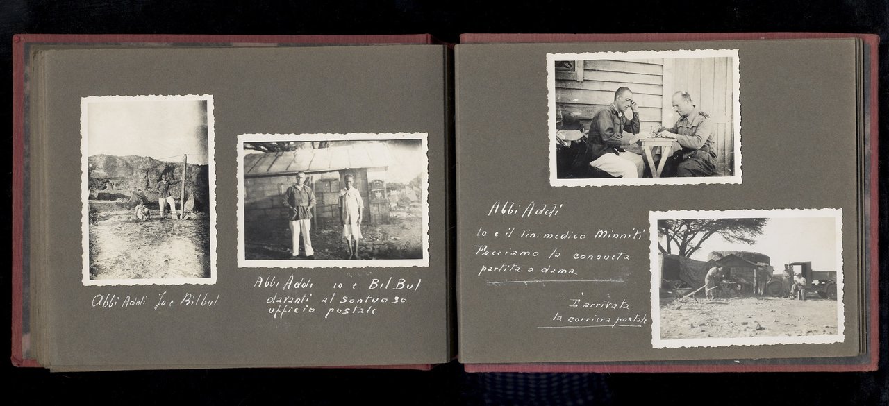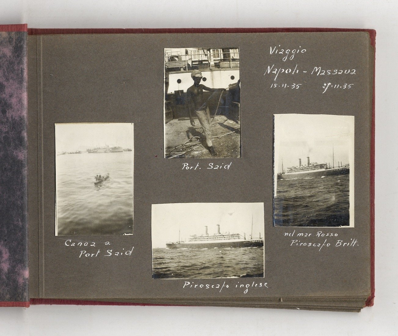 [S.l.], [s.n.], [c. 1936], piccolo album in-8, piacevole cartonatura originale con fregio art déco sulla copertina anteriore, legata con cordoncino al dorso, carte [20] in cartoncino marrone, recanti testo manoscritto in inchiostro bianco (10 pagine) e 33 piccole fotografie originali applicate. 8 carte non sono state compilate. Si tratta del racconto dell'arrivo di un gruppo di impiegati postali all'ufficio postale di Assab, in Eritrea, con il resoconto degli avvenimenti succedutisi fino ai primi mesi del 1936. Le fotografie illustrano quel periodo e i personaggi citati nel racconto. L'autore è anonimo, sebbene raffigurato alcuni degli scatti conservati nell'album. Eccellenti condizioni.