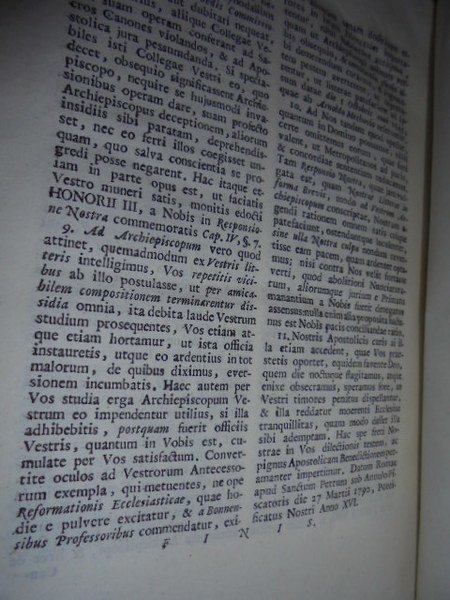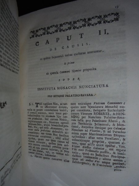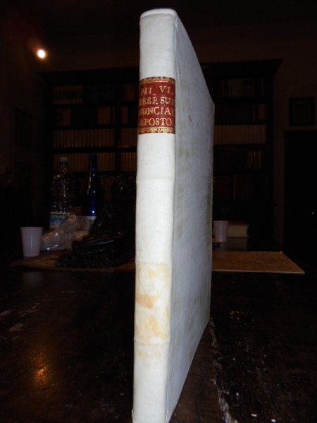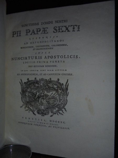 PIUS PAPA SEXTUS (1717 - 1799). Venetiis, typis Simonis Occhi, 1790. RESPONSIO AD METROPOLITANOS MOGUNTIMUN, TREVIRENSEM, COLONIENSEM, ET SALISBURGENSEM SUPER NUNCIATURIS APOSTOLICIS. EDITIO PRIMA VENETA POST SECUNDAM ROMANAM, IN QUA ADDITAE SUNT BINAE LITTERAE AD ARCHIEPISCOPUM ET CAPITULUM COLONIAE. IN- 4°, PERGAMENA COEVA. VII, (1), 288 PP. OTTIMO ESEMPLARE. PIO VI, PAPA DAL 1775, NON RIUSCÌ A FERMARE LO SVILUPPO DEL GIUSEPPINISMO E DEL GIANSENISMO, NONOSTANTE IL VIAGGIO A VIENNA ALLA CORTE DI GIUSEPPE II. SCOPPIATA LA RIVOLUZIONE FRANCESE, INVASO IL SUO STATO CON IL TRATTATO DI TOLENTINO DOVETTE RESTITUIRE AVIGNONE ALLA FRANCIA. FATTO PRIGIONIERO, MORÌ NEL DELFINATO.
