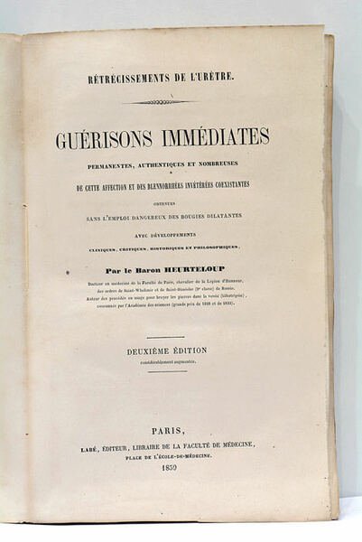 Rétrécissements de l'urètre. Guérisons immédiates permanentes, authentiques et nombreuses de cette affection et des blennorrhées invétérées coexistentes obtenues sans l'emploi dangereux des bougies dilatantes. Avec développements cliniques, critiques, historiques et philosophiques. Deuxième édition considérablement augmentée.